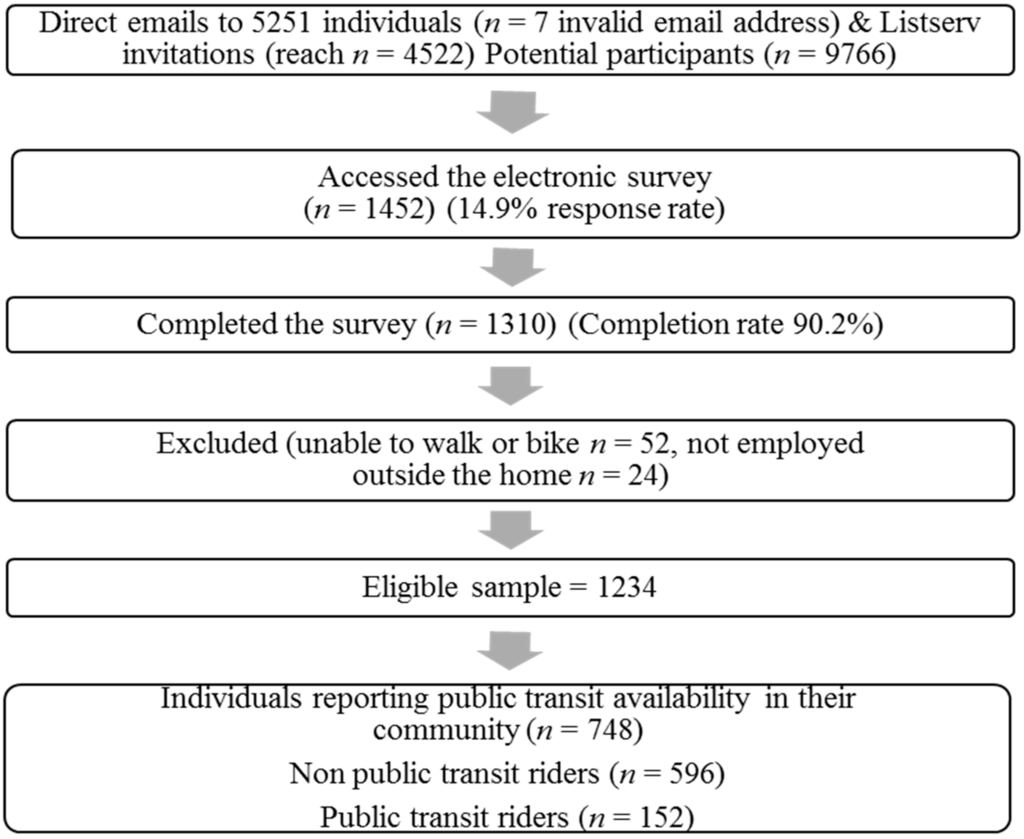 Adults aged 18 years or older, employed full- or part-time outside of the home and physically able to walk or bike were eligible to take part in the survey. Recruitment took place primarily in the mid-Atlantic region of the US (PA, OH, WV, MD, NJ, DE). The websites of large employers (e.g., K-12 school districts, local/county government, private businesses, universities/colleges) in medium-large cities were examined for employee email addresses and individuals were contacted directly via email. These participants received a “closed” survey with a unique URL that was only able to be accessed once. When individual employee email addresses were not available, employers were contacted and asked to distribute an electronic invitation to take part in the survey via listserv, e-newsletter, or mass email, with a link to an open URL. In this situation the number of employees receiving the invitation was noted. Among employers contacted to send out the email invitation, only two employers refused to do so, while 84 did not respond to any attempted contacts, and 56 employers sent out the invitation. The e-contact invited people to take part in a “Commuting survey”. Participants were asked to self-report if they had access to public transportation in their community, and only those who reported yes were included in the analyses. Recruitment of participants is displayed in Figure 1.
