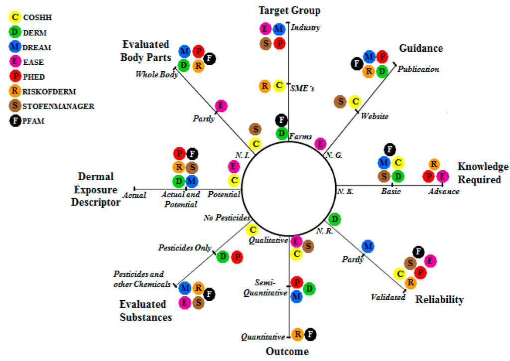 Radar diagram with the multi-criteria analysis for the evaluated models for dermal exposure assessment (NI: Not Included; NG: No Guidance; NK: No Knowledge Required; NR: Not Reliable).