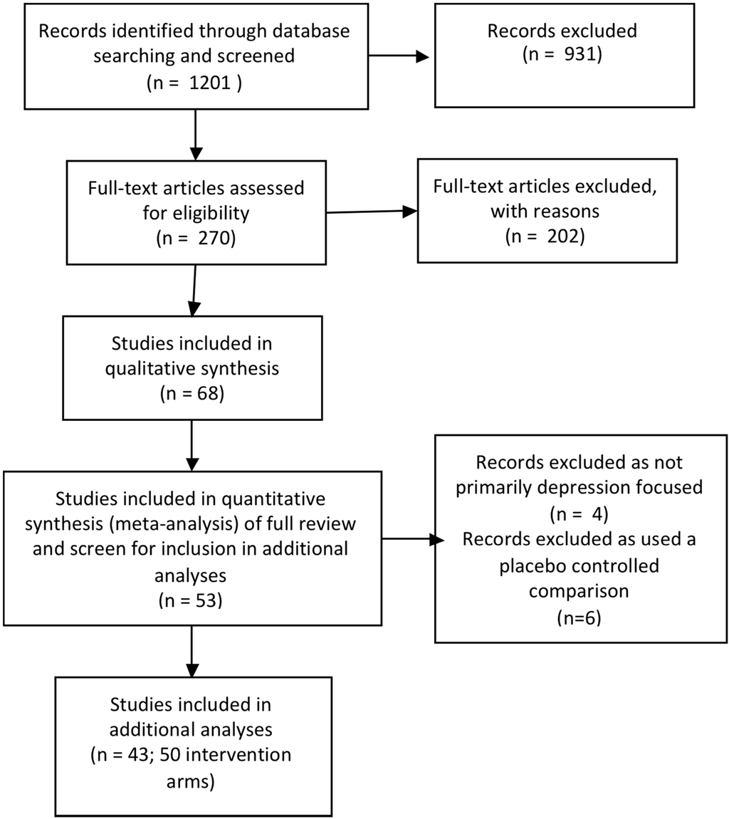 This paper is based on a Cochrane systematic review of depression prevention programs for children and adolescents [] and focuses on additional exploratory analyses of the dataset from this review. The full Cochrane review contains 68 trials. In this study we have only included those trials that provided data for the meta-analyses for post intervention, 3 to 9 month and 12 month follow-up. As our main aim was to explore how various characteristics of interventions tested in prevention trials modified treatment effects, we sought to reduce heterogeneity between the trials and as a result, excluded the following: trials that compared an intervention to a placebo group (where non specific factors are controlled but no active treatment ingredients are included) and those trials where the primary aim or target was not depression prevention. (see Figure 1 for flow diagram). Therefore, in all there are 43 trials with 50 intervention arms included in this secondary analysis. The Cochrane Collaboration systematic review methodology was used as outlined in the Cochrane Handbook for Systematic Reviews of Interventions [] and there is a full description of the methods in Merry et al., 2011 [].