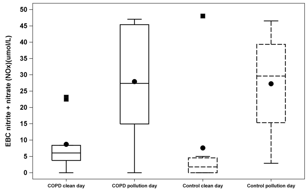 Exhaled breath condensate (EBC) nitrite + nitrate (NOx) between pollution and clean air testing days. Box-and-Whisker plots shows the distribution of exhaled breath condensate (EBC) nitrite + nitrate (NOx) between pollution and clean air testing days classified by COPD versus Control groups. Black filled dots represent mean of EBC nitrite + nitrate (NOx). Black filled squares represent the outliers (above maximum value). The “whisker” represents minimum and maximum values. The box plot goes from upper (75) percentile, median and lower (25) percentile of the values.