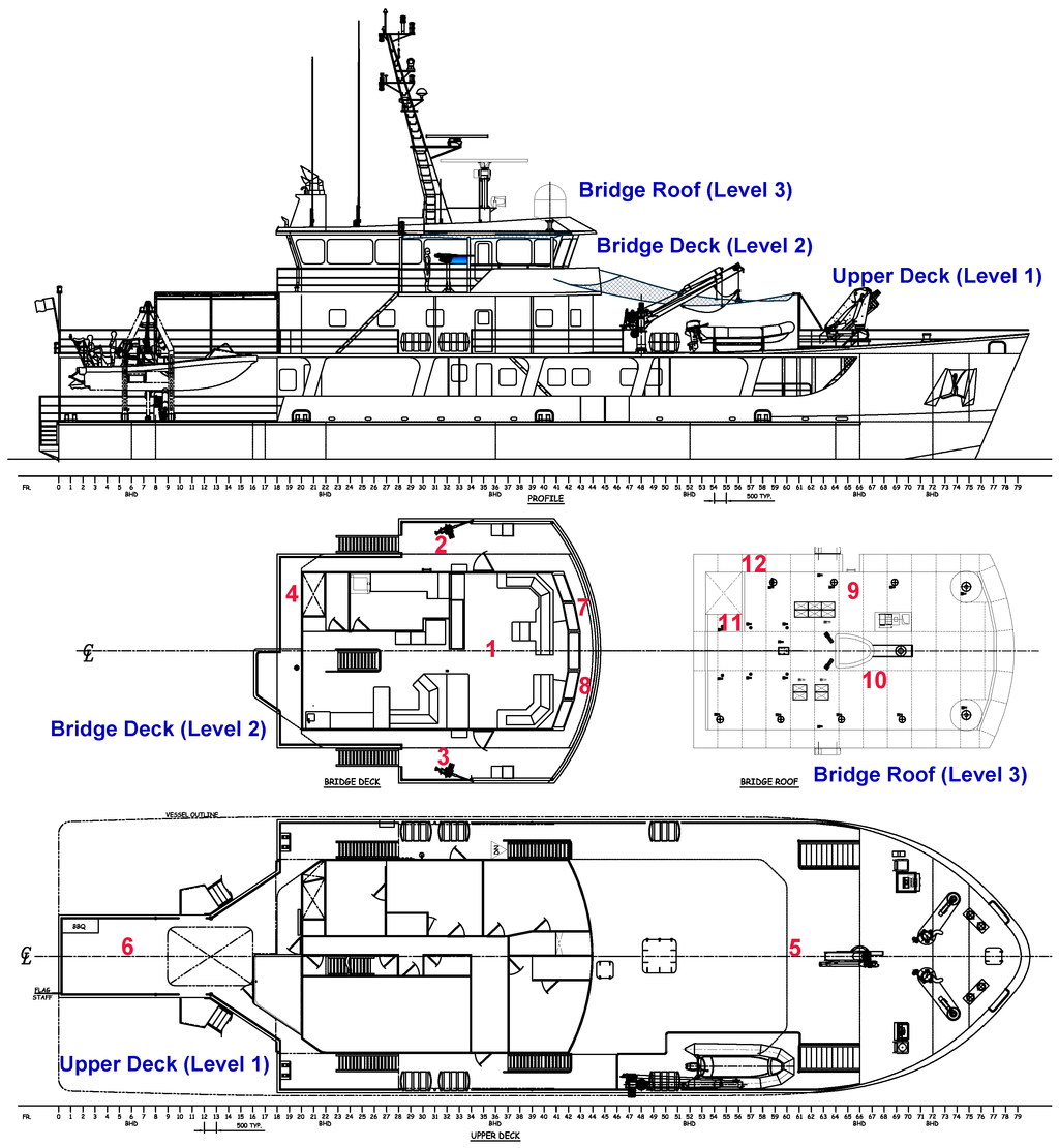 Measuring locations in all 3 levels of the ship.