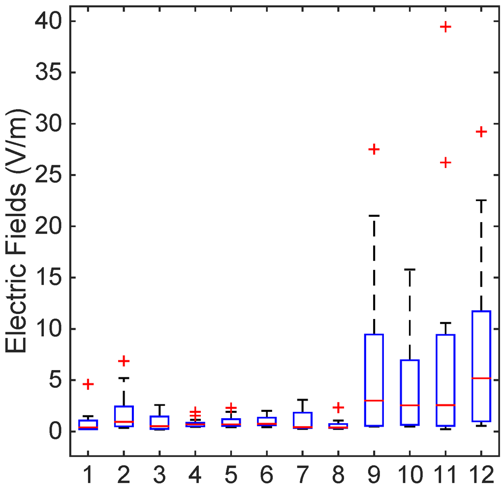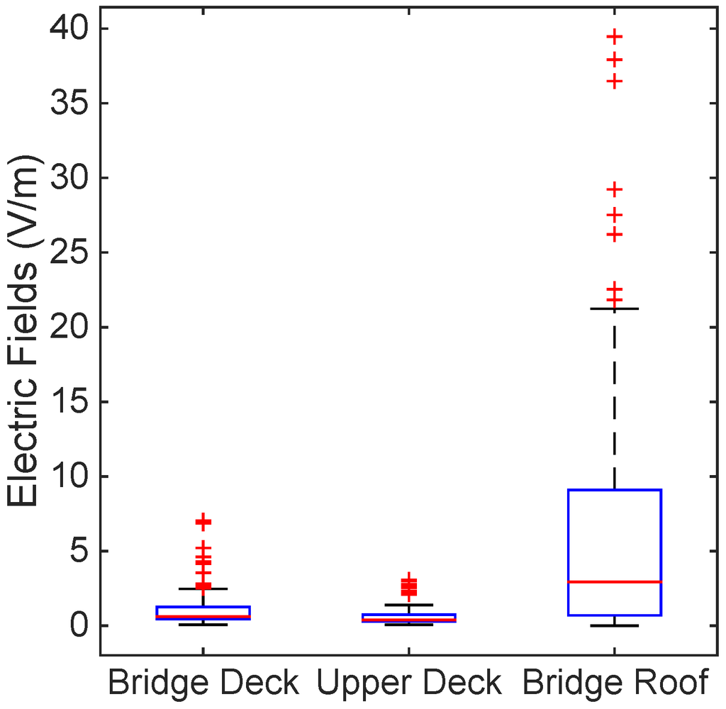 Figure 2, Figure 3 and Figure 4 show the levels of the electric fields from the marine ship transmitters using box plots with a median and interquartile range. The T-bars (whiskers) were extended to 1.5-times the height of the box (IQR). A “+” symbol depicts a value more than three IQRs from the end of the box (the extreme outlier). A few points with high electric field strengths that exceeded the ICNIRP and the ARPANSA limits for the general public were observed on the bridge roof, as in Figure 2; nevertheless, the occupational limits were respected everywhere. Thus, this complies with the occupational and general public reference levels of the ICNIRP guidelines and the ARPANSA standards.