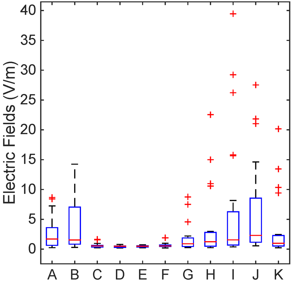 Electric field level measurement by different locations, as in Table 2 using box plots with a median and interquartile range. The T-bars (whiskers) were extended to 1.5-times the height of the box (IQR). A “+” symbol depicts a value more than three IQRs from the end of the box (the extreme outlier). The ICNIRP and the ARPANSA limits for the general public were exceeded on the bridge roof; nevertheless, the occupational limits were respected everywhere.