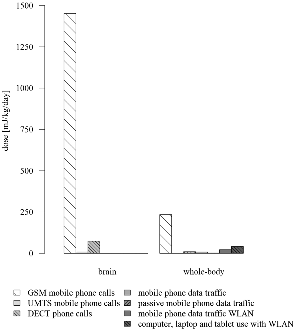 The highest dose rate (dose per 1 min) was found for calls on the mobile phone on the GSM network (without headset) with 191.88 mJ/kg/min and 24.66 mJ/kg/min followed by calls on the DECT phone (without eco mode) with 22.38 mJ/kg/min and 3.06 mJ/kg/min for brain and whole-body, respectively (Table 3). Considering all predictors, the brain near-field dose consisted mainly of the exposure from GSM mobile phone calls, on average 1451.78 mJ/kg/day (94.6%), followed by a dose of 74.10 mJ/kg/day (4.8%) from DECT phone calls (Table 3 and Figure 1). UMTS mobile phone calls counted for 8.04 mJ/kg/day (0.5%). Concerning the whole-body near-field dose, the largest part was induced by GSM mobile phone calls with a dose of 234.47 mJ/kg/day (73.3%). DECT phone calls contributed with a dose of 10.13 mJ/kg/day (3.2%). The dose contribution from mobile phone data traffic was 8.29 mJ/kg/day (2.6%) for data traffic via mobile internet connection and 22.03 mJ/kg/day (6.9%) for data traffic via WLAN connection. Using a computer, laptop and tablet connected to WLAN played a considerable role with a mean dose of 41.46 mJ/kg/day (13.0%).