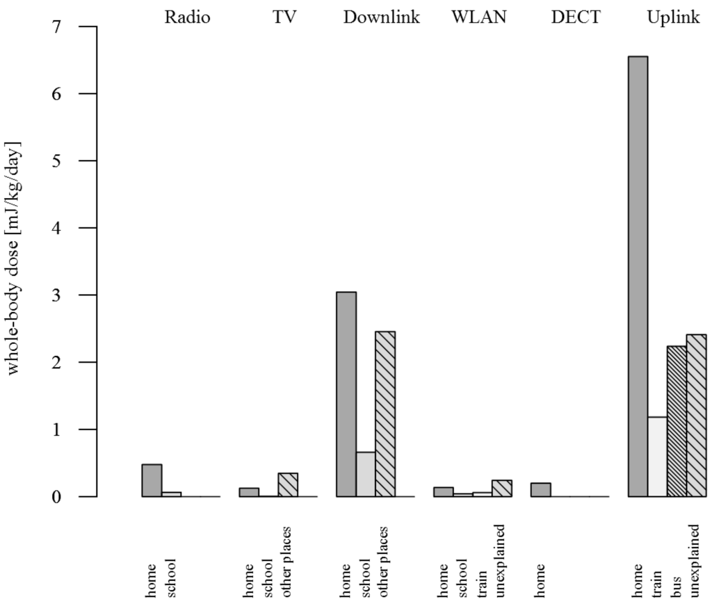 The cumulative dose was highest for downlink and uplink for both brain and whole-body dose, whereas dose contributions from radio, TV, WLAN and DECT were small compared to the contributions from downlink and uplink (Table 4 and Table 5). The downlink dose was 8.43 mJ/kg per day (33.5%) for the brain and 6.16 mJ/kg per day (30.4%) for the whole-body. The uplink dose was 15.22 mJ/kg per day (60.4%) for the brain and 12.38 mJ/kg per day (61.2%) for the whole-body. It was mainly the exposure at home and other places (outdoors, in trains, buses and cars and locations not further defined in the diaries) that contributed to the downlink exposure (Figure 2). Being at home and, to a smaller extent, spending time in trains and buses contributed to the uplink exposure whereas a considerable part remained unexplained.
