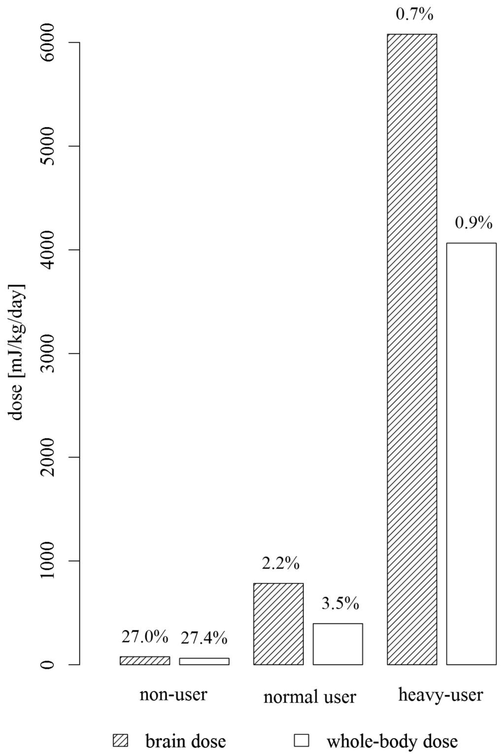 Total brain and whole-body dose for the three HERMES study participants (non-user, normal user, heavy-user); Percentages of the far-field dose on the total dose are indicated above the bars.