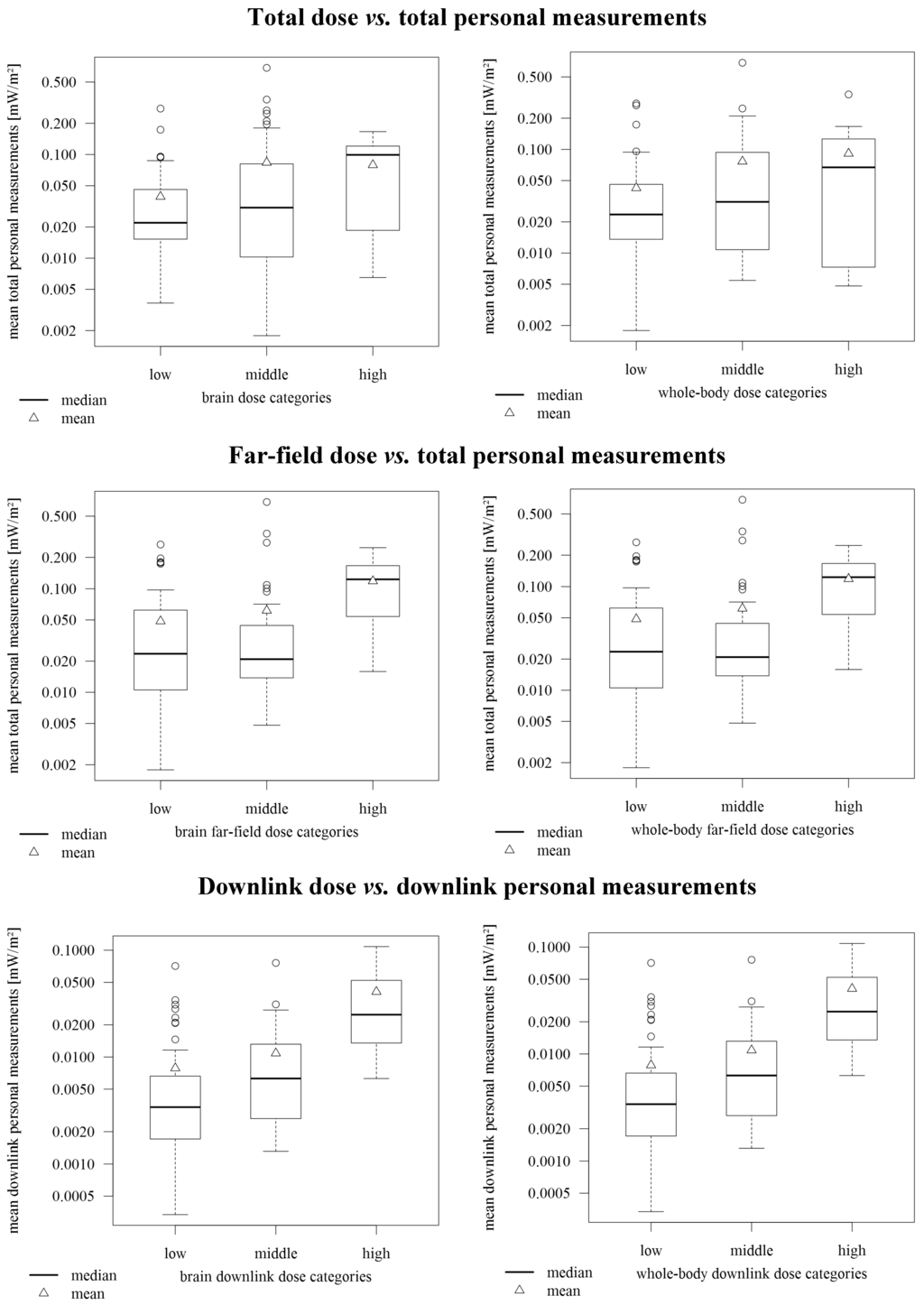In Figure 4 dose predictions are compared with personal measurements. With respect to total dose (first row of Figure 4) there was a slight tendency that the group median of the personal measurements increased with increasing predicted dose. The Spearman correlation between the dose and the mean of the personal measurements was 0.10 (p-value = 0.34) for the brain dose and 0.05 (p-value = 0.63) for the whole-body dose. For the far-field dose the picture was similar, but with a slightly higher correlation of 0.18 (p-value = 0.08) for the brain far-field dose and 0.17 (p-value = 0.09) for the whole-body far-field dose (second row of Figure 4). If taking into account only the downlink dose and the downlink measurements (third row of Figure 4) the mean and the median of the measurements were clearly increased for increasing predicted dose. The Spearman correlation was 0.53 (p-value < 0.0001) for the brain downlink dose and 0.52 (p-value < 0.0001) for the whole-body downlink dose.