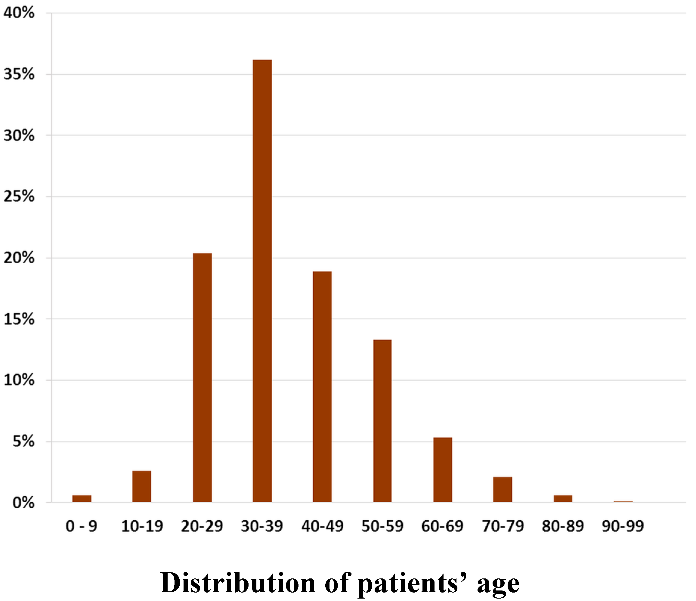 Among the ambulatory visits to OB-GYNs, 98.1% involved female patients, and only 1.9% were male patients. Stratifying the data by age group revealed that patients aged 30–39 years had the highest proportion (36.2%, n = 12,810) of ambulatory visits to OB-GYNs, followed by patients aged 20–29 years (20.4%, n = 7234). Female patients of around childbearing age accounted for more than half the total number of ambulatory visits to OB-GYNs (Figure 1).