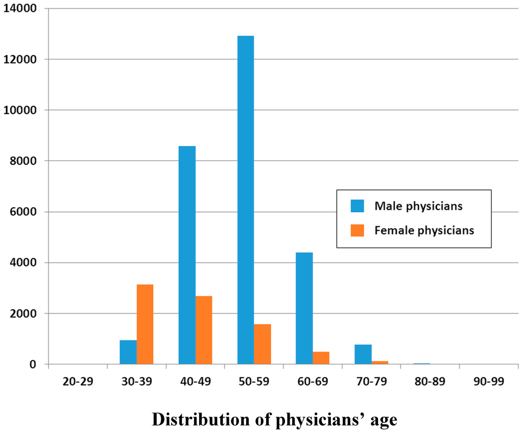 The number of ambulatory visits to OB-GYNs is presented in Figure 2. It reveals that there are far fewer male physicians in the 30–39 years (n = 958) age range than in other working-age ranges, that is, 40–49 (n = 8577), 50–59 (n = 12,913), and 60–69 (n = 4405). The number of female physicians was the highest in the 30–39 years (n = 3,133) range compared with the other working-age ranges, even exceeding the number of male physicians in that age range. The ratio of female to male physicians was more than triple in the 30–39 age range (3133/958).