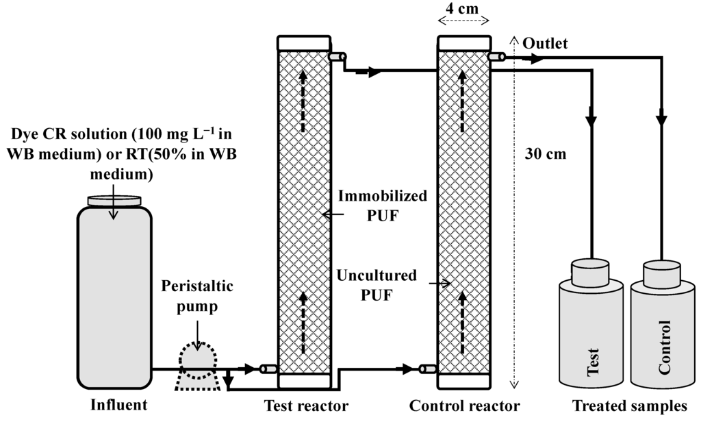 Glass columns (4 × 30 cm, total volume 200 mL) with a void volume of 50 mL were used for reactor development. The glass columns, silicon tubing and other accessories were autoclaved and connected aseptically. Microbial consortium-immobilized PUF cubes were filled into the column (20-cm bed) which served as test reactor, while a column filled with uncultured PUF cubes (without microorganisms) served as control reactor. The purpose of the control reactor was to confirm that the removal of dyes was not due to adsorption onto the PUF surface. The column reactors were installed as shown in Figure 1. Decolorization experiments for treatment of CR dye (100 mg·L−1 in WB medium) and RTE (50% in WB medium) with continuous upward feeding were conducted at various flow rates (5 to 50 mL·h−1) while keeping other parameters such as WB medium pH 7.5 and laboratory ambient temperature 30 ± 0.2 °C unchanged. The hydraulic retention time (HRT) was determined by dividing the effective volume of bioreactor by the influent flow rate. The as treated samples were collected from the outlet of the reactors and the percentage of dye decolorization and textile effluent ADMI removal measured. After optimizing the flow rates for enhanced decolorization performance, the upflow column bioreactors were again operated under optimum conditions and the mineralization of dye and textile effluent were determined. Decolorized CR dye samples were further analyzed using analytical techniques to reveal the biotransformation mechanism.