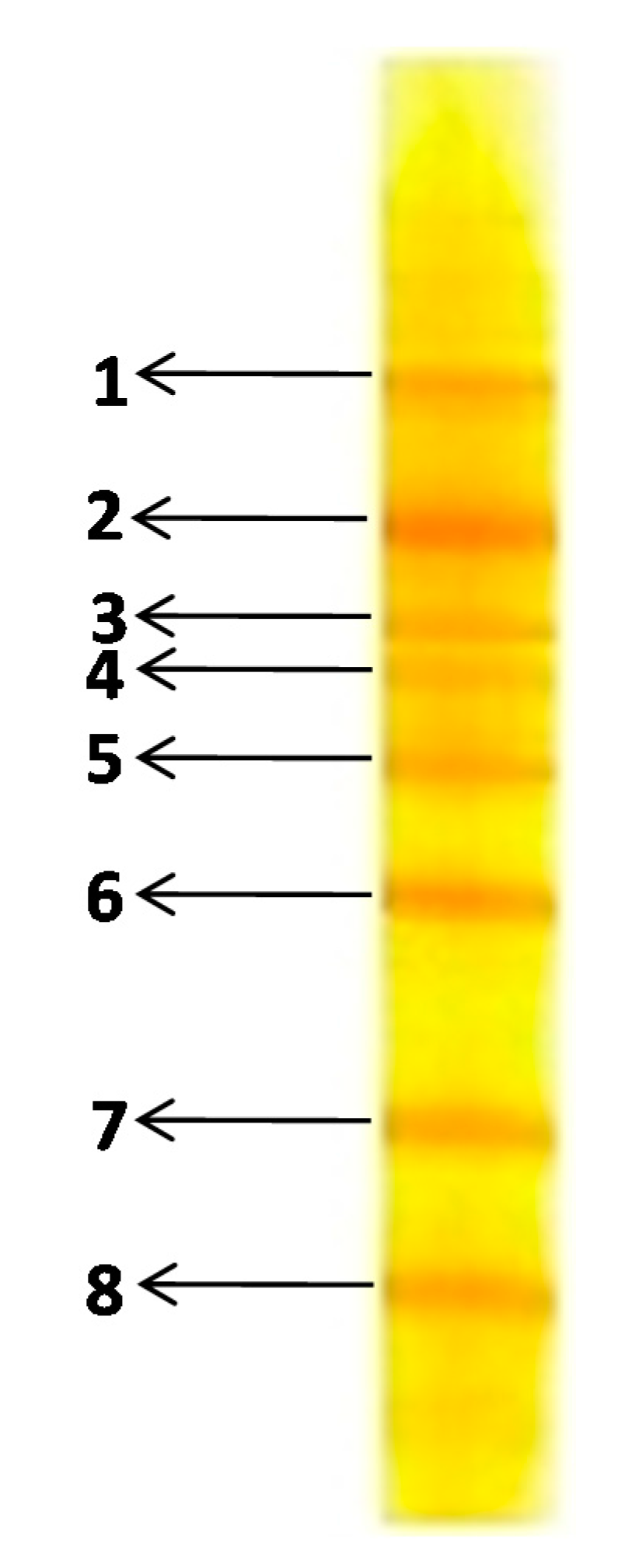 As there are well-established concerns about the potential health hazards caused by azo dyes, a microbial consortium that could decolorize the model azo dye CR was enriched from textile wastewater disposed soils. The microbial diversity of the enriched microbial consortium was analyzed to demonstrate the metabolic potential and ecological functions of the textile wastewater disposal soil inhabitants. The microbial communities of contaminated sites are known to be responsible for overall metabolism and thus remediation of pollutants present. Many studies have attempted to explore the correlation between number of microbes present in textile wastewater dump sites and their dye degradation potential by means of DGGE analysis [22,29,31]. DGGE separates the PCR amplified DNA of the same size but different sequences and therefore each band formed in the denaturant gradient gel reveals the presence of a single bacterium [41,42]. The results of the PCR-DGGE analysis of 16S rRNA sequences revealed a total of eight distinctive bands, suggesting the presence of eight different bacteria in the enriched consortium (Figure 2). A study on the degradation of coagulated textile dyes sludge under solid state fermentation conditions also indicated that the developed microbial consortium from highly polluted textile industry sites possess 10 different bacteria as analyzed by DGGE [29]. Similarly, a microbial consortium enriched from dye contaminated soil that could degrade the azo dye Trypan blue has revealed the presence of 16 different bacteria [22]. Here, the main purpose of DGGE analysis was to estimate the number of bacteria present in te developed consortium that could grow in WB medium and decolorize the dye. Such a microbial consortium could be used under non-sterile conditions for the mineralization and detoxification of dyes; thus the bacterial identification part has been not incorporated in the current investigation.