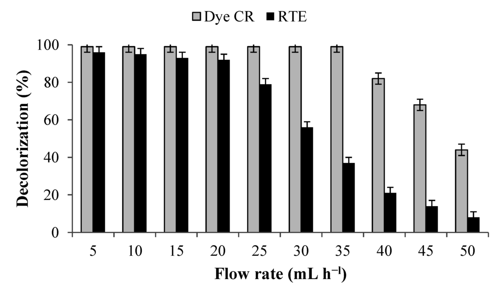 Decolorization of CR dye (100 mg·L−1) and RTE (50%) by PUF-immobilized microbial consortium under upflow column bioreactor conditions at various flow rates. Data points indicate the mean of three independent replicates; ±SEM is indicated by error bars.