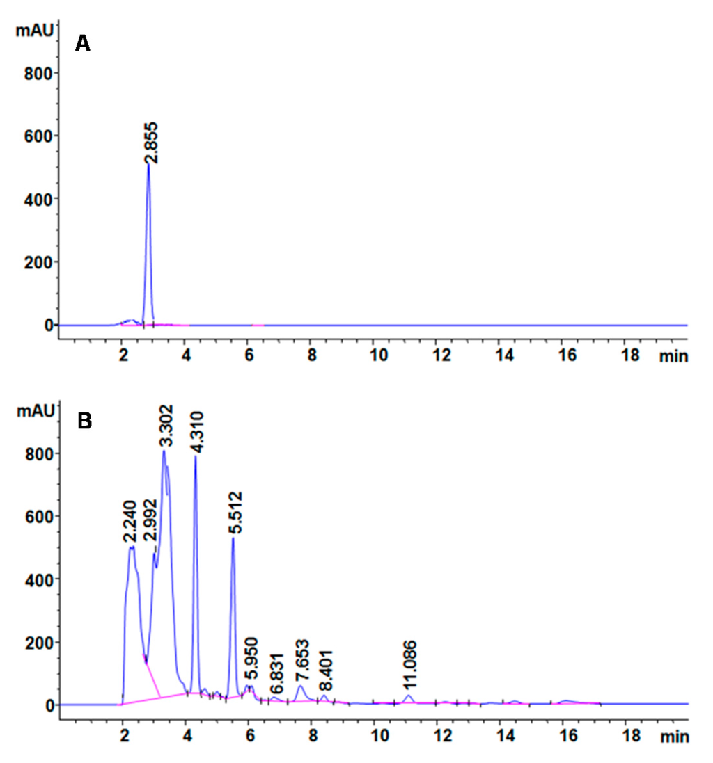 HPLC profile of (A) CR dye and (B) its decolorized products obtained after treatment with PUF-immobilized microbial consortium in an upflow column bioreactor.