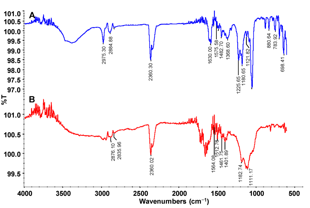 FTIR analysis of the dye control and its products after decolorization by the PUF-immobilized microbial consortium in an upflow column bioreactor was carried out to check the changes in functional groups. The FTIR spectral peaks 2975.30 and 2884.88 cm−1 observed in the CR dye control represent C–H stretching as in alkanes (–CH3–) while the 2360.30 cm−1 band represents NH+ stretching as in charged amines (C=NH+) (Figure 7A). The specific peaks at 1630.00 and 1575.58 cm−1 indicate the presence of azo –N=N‒ double bond stretching as in azo compounds. In addition, the 1482.70, 1368.60, 1225.65, 1180.65 and 1121.82 peaks represent C–H deformation of alkanes, CH3 deformation of tertiary butyl symmetric CH3 bending, skeletal stretching of alkanes and C–N vibration of aliphatic amines, respectively. The 880.64 peak corresponds to the C–H deformation of a tetra or penta-substituted benzene containing one free hydrogen.