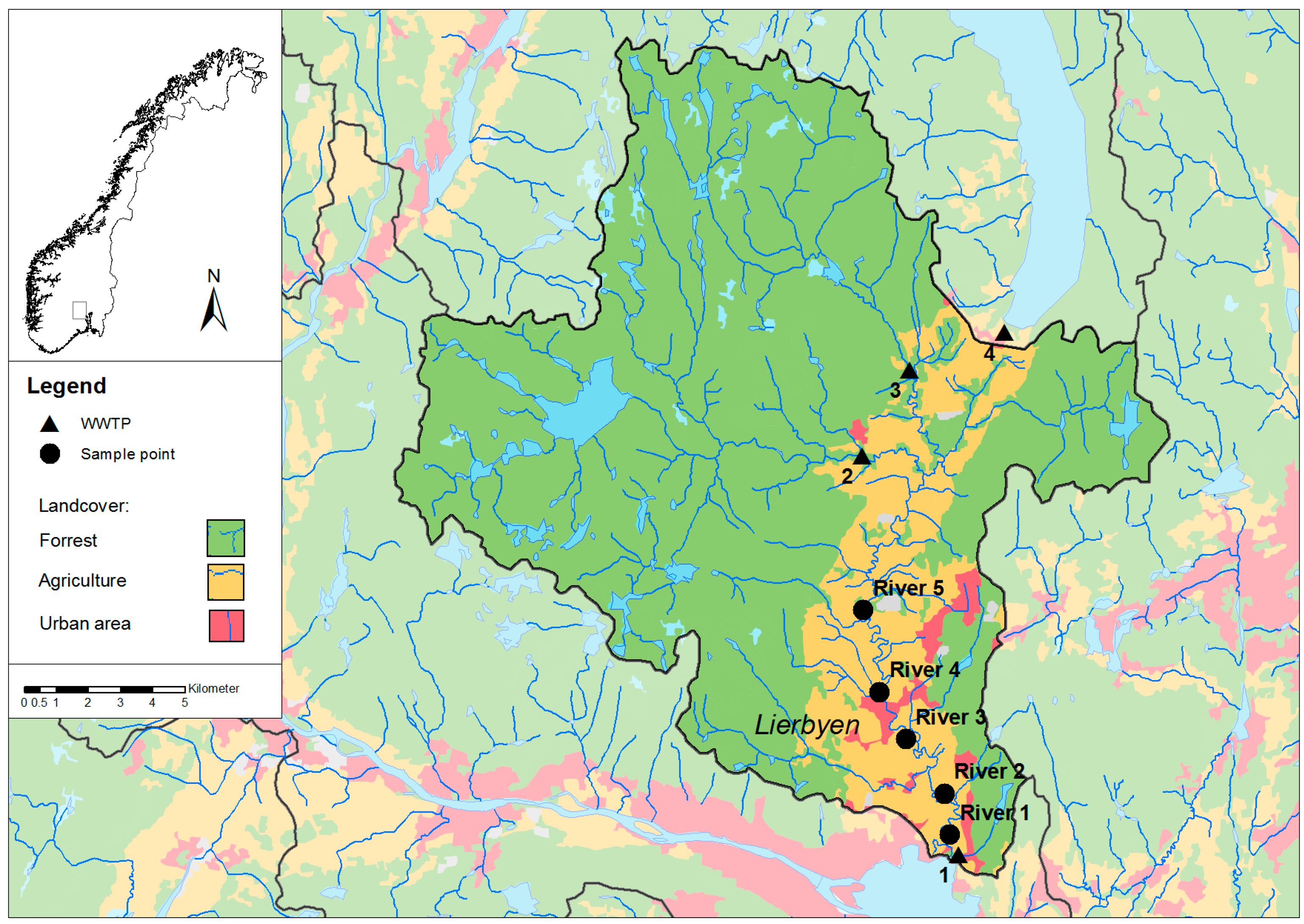 Study area: The Lier River catchment area with different land cover types, the four municipal WWTPs and the municipal river sampling points.