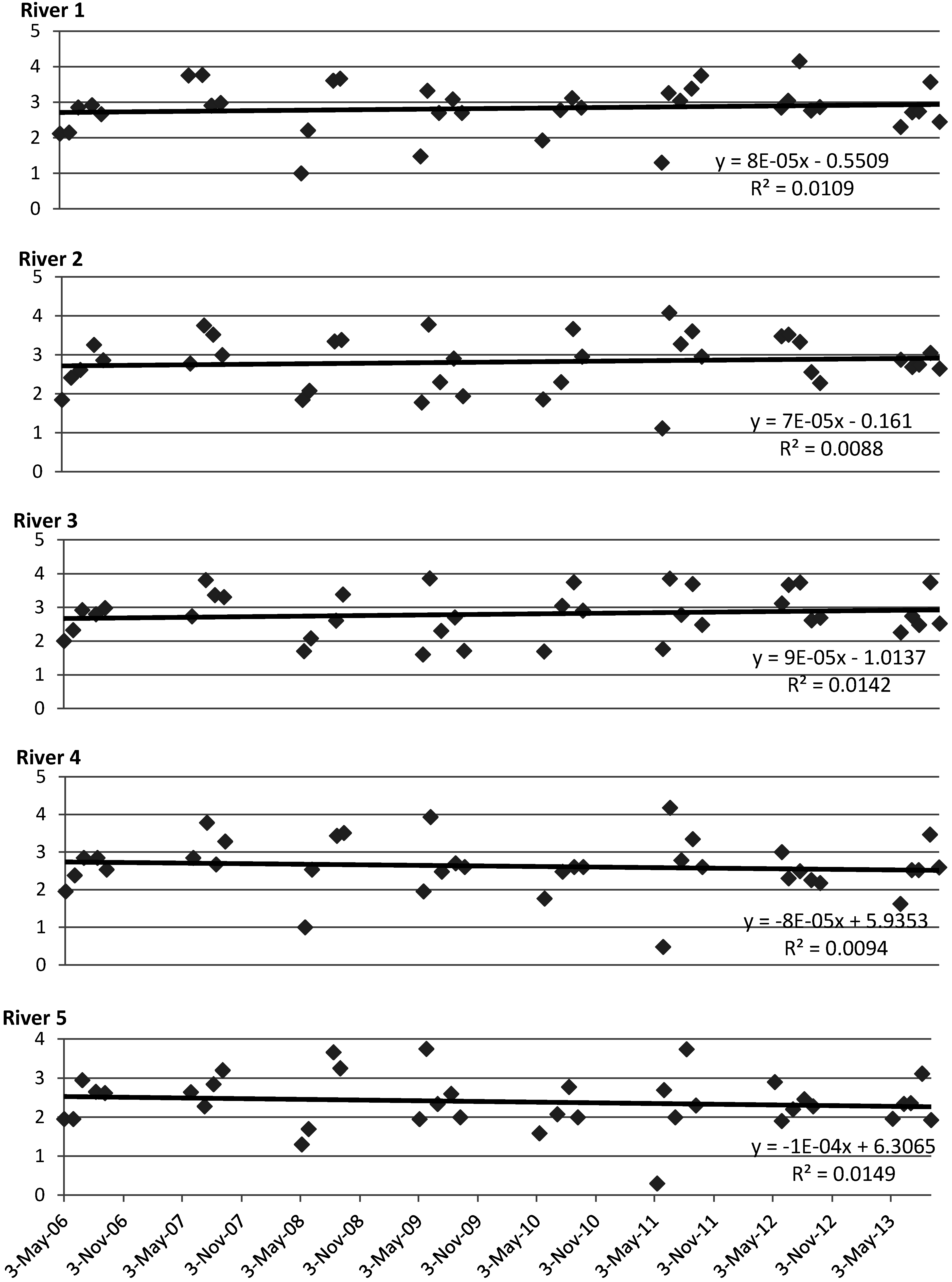 | River 5 | 2.03 | 0.3–3.2 | −2 × 10−4 | 8.11 | 0.046 | 0.213 | −2.940 | Yes |