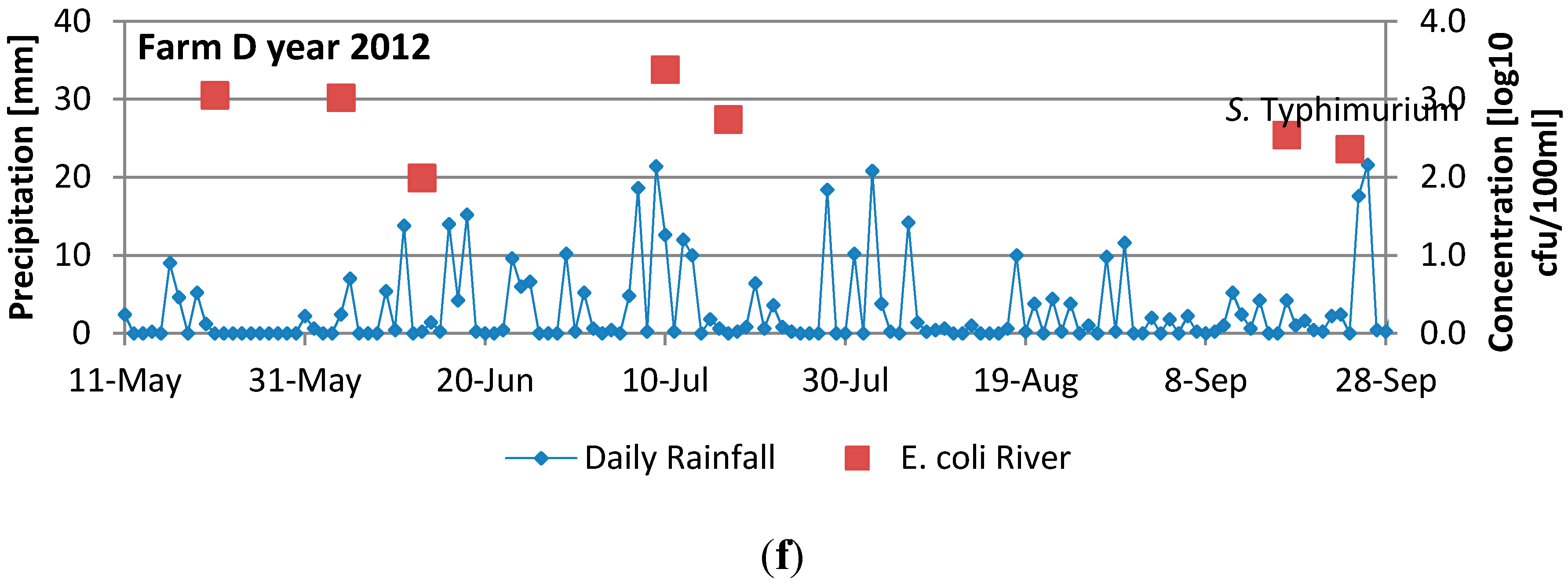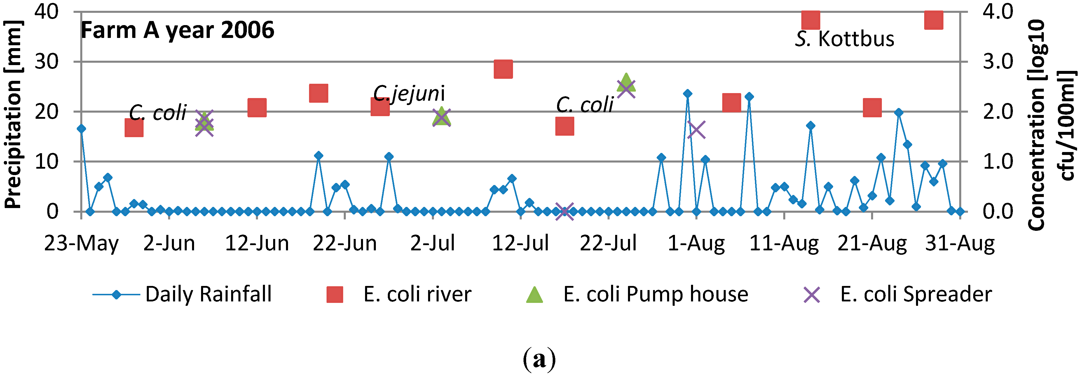 Pathogenic bacteria were also occasionally isolated from the water, with Campylobacter spp. Being isolated from six samples (three in 2006 and three in 2012 ) and Salmonella from three samples (one in 2006 and two in 2012) [35]. In some cases, peaks in numbers of fecal indicators follow directly after heavy rainfall, but this is no always the case. There are also no obvious association between presence of pathogens and rainfall. For example for farm B in 2012, both C. jejuni and Salmonella Newport were isolated after a period with no precipitation.