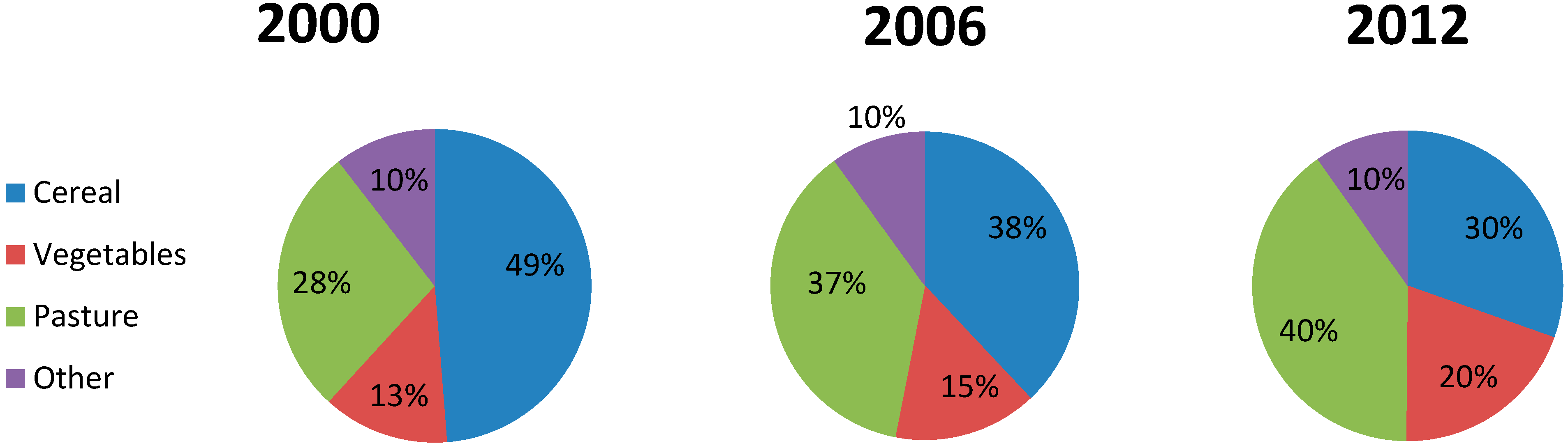 There has been a shift in agriculture to fewer and larger farms. The total area used for agriculture is almost the same; 37.6 km2 in 2000 and 36.7 km2 in 2012 [29]. There has also been a shift from cultivation of cereal towards vegetables and pastures, see Figure 5.