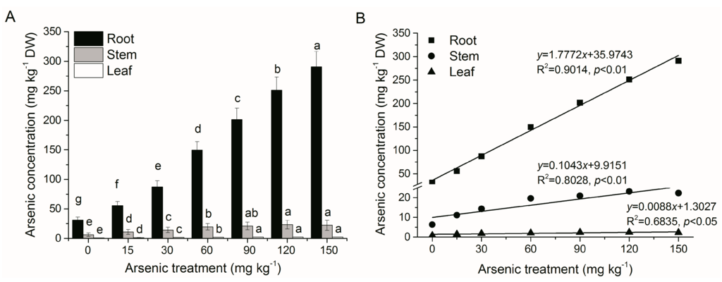 Effects of As treatments on (A) As concentrations in root, stem and leaf, and (B) linear relationship between As treatment concentrations and As concentrations in root, stem and leaf in A. corniculatum seedlings. Values are mean ± SE (n = 5). Different letters above comparable columns in Figure 1A indicate significant differences at p < 0.05.