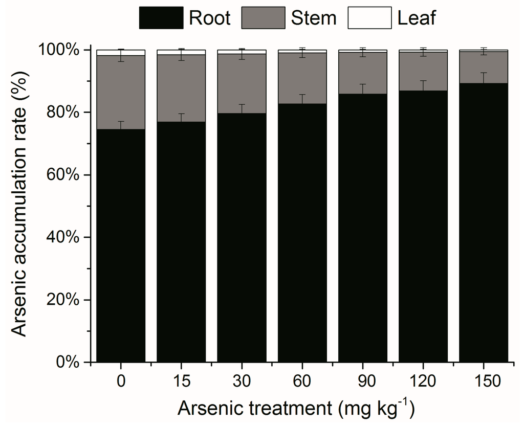 As accumulation in A. corniculatum differed with As treatment levels and plant tissues (Figure 1A). As concentrations in roots, stems and leaves were increased by increasing of As treatment concentrations (0–150 mg·kg−1), with significantly linear expression (R2 > 0.68, p < 0.05) (Figure 1B). As mainly accumulated in roots (30.29–294.85 mg·kg−1 DW), at levels which were 4.77–13.20-fold higher than those in stems, and 34.23–127.64-fold higher than those in leaves at soil As concentrations of 0–150 mg·kg−1. As accumulation rates in roots were 74.54%–89.26% of the total As accumulation (average 82.23% ± 2.06%), while those in stems were 23.68%–10.23% (average 16.68% ± 1.88%) and in leaves only 1.78%–0.51% (average 1.09% ± 0.18%) (Figure 2). An increasing trend of As accumulation rates in roots was found in roots with increasing As treatment concentrations, while opposite trends were found in stems and leaves. High As accumulation in roots was observed in other species like rice [], ferns [] and the mangrove species Kandelia obovata []. Transport of non-essential elements was interpreted by cell wall immobilization and/or sequestering of the epidermal layers []. Thus mangrove plants absorb and store non-essential elements in the perennial tissues, especially roots []. A. corniculatum root tissues might be a bio-indicator of As in polluted sediments, as As concentrations in roots are reflective of environmental levels.