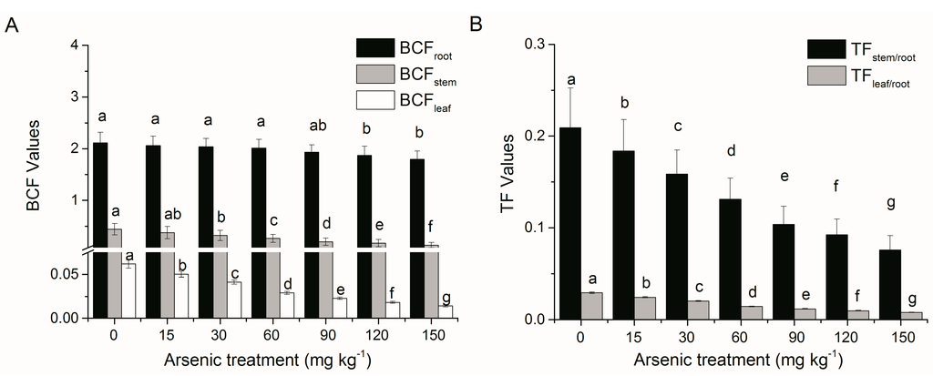 Effects of As treatments on (A) bioconcentration factor (BCF) of root, stem and leaf, and (B) translocation factor (TF) from root to stem and leaf in A. corniculatum seedlings. Values are mean ± SE (n = 5). Different letters above comparable columns indicate significant differences at p < 0.05.
