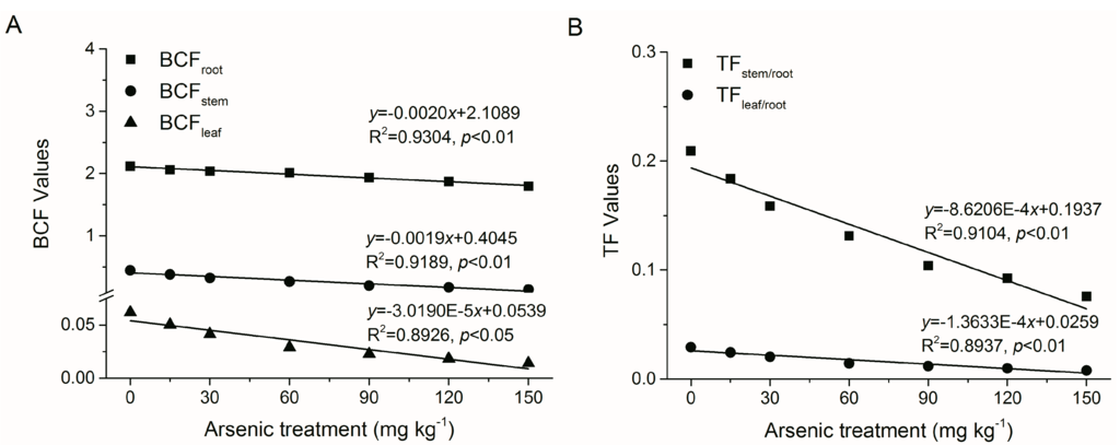 BCF and TF were further employed to evaluate the ability of A. corniculatum to accumulate and translocate As. At treatments of 15–120 mg·kg−1 As, BCFroot was reasonable-high (ranged of 2.12–1.79), but BCFstem (0.44–0.14) and BCFleaf (0.06–0.01) were low, with values at 150 mg·kg−1 As decreased by 15.18%, 69.29% and 77.25% as compared to the control, respectively (Figure 3A). Meanwhile, TFstem/root (0.21–0.08) and TFleaf/root (0.02–0.008) were also extremely low, and values at 150 mg·kg−1 As decreased by 63.80% and 73.18% as compared to the control, respectively (Figure 3B). Significant negative correlations were found between TF or BCF values and soil As concentrations (R2> 0.89, p < 0.05) (Figure 4A,B). However, BCFroot values decreased slightly with increasing As treatment concentrations (0–150 mg·kg−1), while BCFstem and BCFleaf decreased sharply, resulting in great reductions in TFstem/root and TFleaf/root values. These results demonstrated that most of the As absorbed from the soil was retained in the roots and only small amounts were transported to the stems and leaves. Mangroves with high BCFroot (e.g., Kandelia obovata [], Avicennia marina [,], Phragmites australis []) are appropriate candidates for phytostabilisation, retaining metallic inputs and thereby reducing transport to adjacent estuarine and marine systems. Besides, it was suggested that plant species with high BCFroot (>1) and low TFs (<1) could be considered as a potential candidate for the phytostabilization [,]. In the present study, high BCFroot (>1) and low TFs (<1) were observed at high soil As concentrations, suggesting that A. corniculatum is a potential candidate mangrove species for As phytostabilization in tropical and subtropical estuarine wetlands.