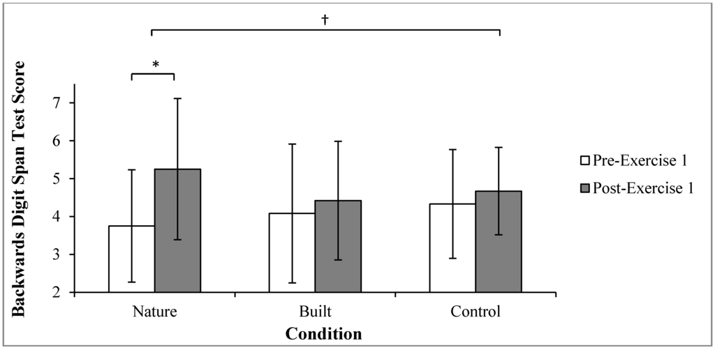 Mean (±SD) pre- and post- Exercise 1 Backwards Digit Span test scores by condition; Higher score represents greater level of directed attention; *, pre- and post- Exercise 1 values significantly differ (p = 0.001); †, significant time by condition interaction (p = 0.007).