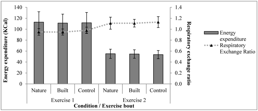 One-way repeated measures MANOVAs indicated that there was no significant effect of condition on energy expenditure and respiratory exchange ratio for either Exercise 1 (p = 0.34) or Exercise 2 (p = 0.63). Energy expenditure and respiratory exchange ratio values are shown in Figure 2. One-way repeated measured ANOVAs indicated no statistically significant effect of condition on mean heart rate values in either Exercise 1 (p = 0.36) or Exercise 2 (p = 0.88; Table 1).