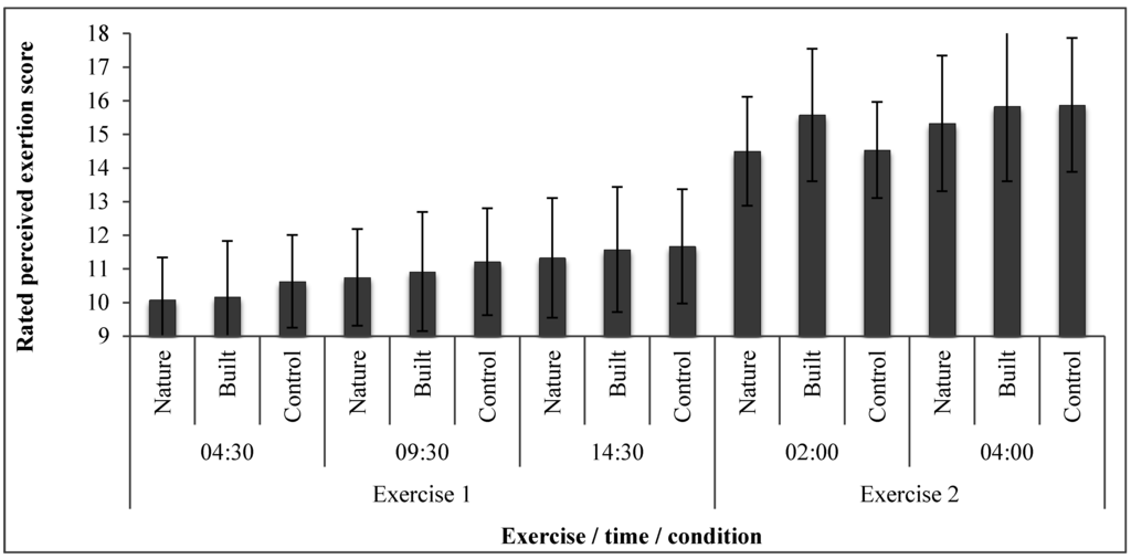 Concurrent with previous findings relating to transient hypofrontality, directed attention improved from pre- to post-exercise in all conditions [19,20,21]. However, it is not possible within the current study to confirm this mechanism. Without inclusion of a non-exercise control condition, these acute improvements might also be considered to be short-term learning or motivational effects. The primary hypothesis that directed attention would improve more after a 15-min exercise bout whilst viewing video footage of a nature environment, compared to footage of a built environment or viewing a blank screen (control), was supported. Significant improvements in directed attention were observed in the nature condition but did not in the built or control conditions. This finding is concurrent with that of Berman et al. [5]. One possible explanation for this finding is that the nature video reduced the need for directed attentional processes, maximizing attention restoration during the opportunity afforded by Exercise 1 [16,18,30]. To the authors’ knowledge, this is the first study to demonstrate an effect of visual environment on directed attention whilst controlling exercise. This is also the first study to combine measures of attention following steady-state exercise with measures of perceived exertion and time to exhaustion during vigorous exercise. A strength of this study was that it rigorously controlled exercise between conditions. Exercise intensities (speed/gradient) of Exercise 1 and Exercise 2 were replicated via programming of a treadmill, to ensure that the independent variable of visual environment was isolated. Unlike previous research [5,6,59], it is possible to conclude that visual nature facilitates attention restoration during exercise independently from influences of exercise.