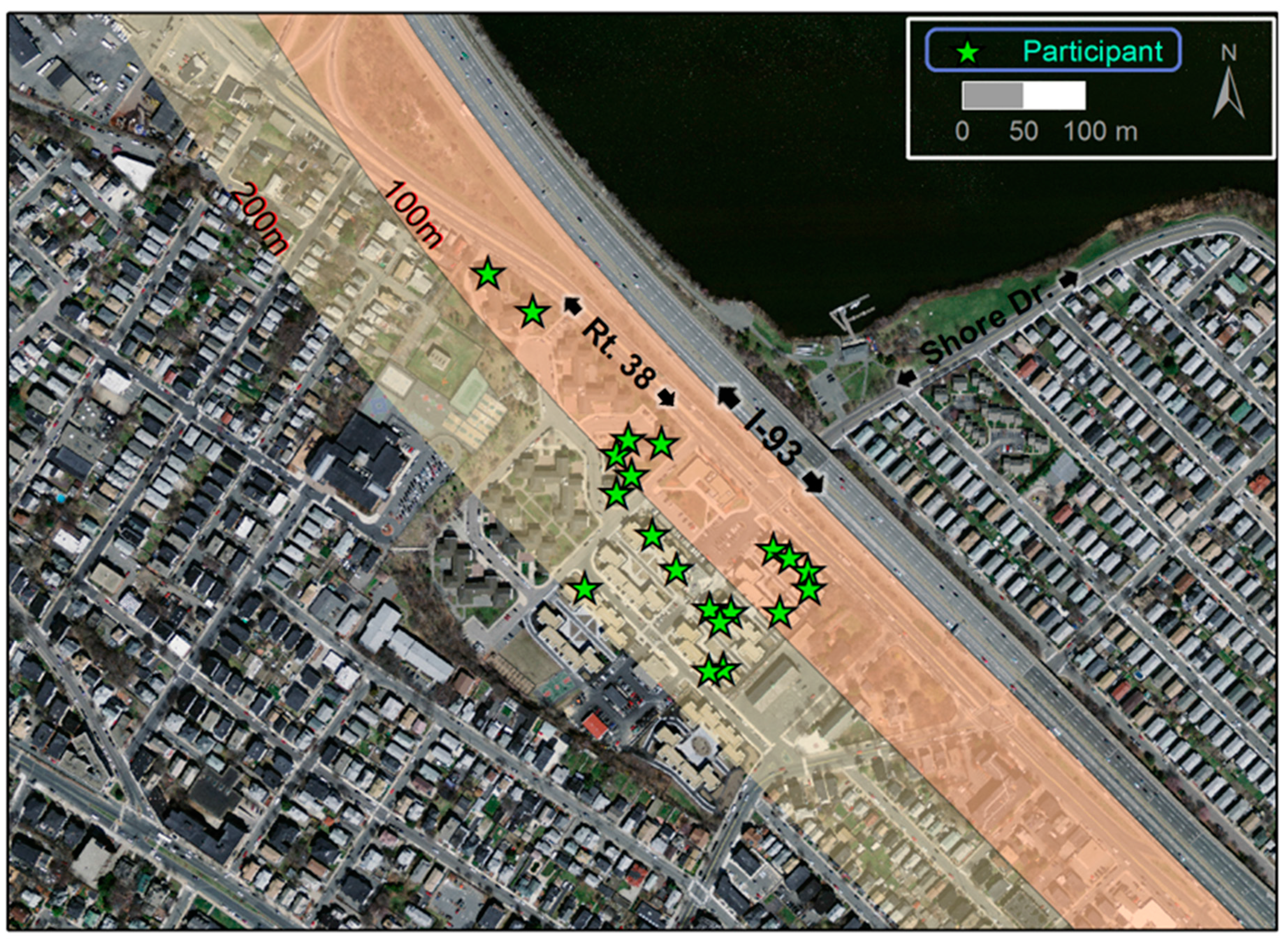 The study was conducted in 20 apartments (21 participants) in the Mystic View and Mystic River housing developments in Somerville. One apartment was excluded from the analysis due to a problem with the air monitoring equipment; thus, our final data set included 19 apartments and 20 participants. The two developments are adjacent to one another as well as to I-93 and Massachusetts State Highway 38 (Rt-38; >30,000 vehicles per day [38]; Figure 1). I-93 rises to as high as 6-m-above grade next to the developments and is filled underneath except for the underpass at Shore Drive; Rt-38 runs at grade parallel to I-93. Participants were at least 40 years old, did not smoke or allow smoking inside their homes, and their apartments were within 200 m of I-93. Recruitment was in three languages: English, Haitian Creole and Spanish. Details of recruitment and our interaction with the participants are described elsewhere [42].