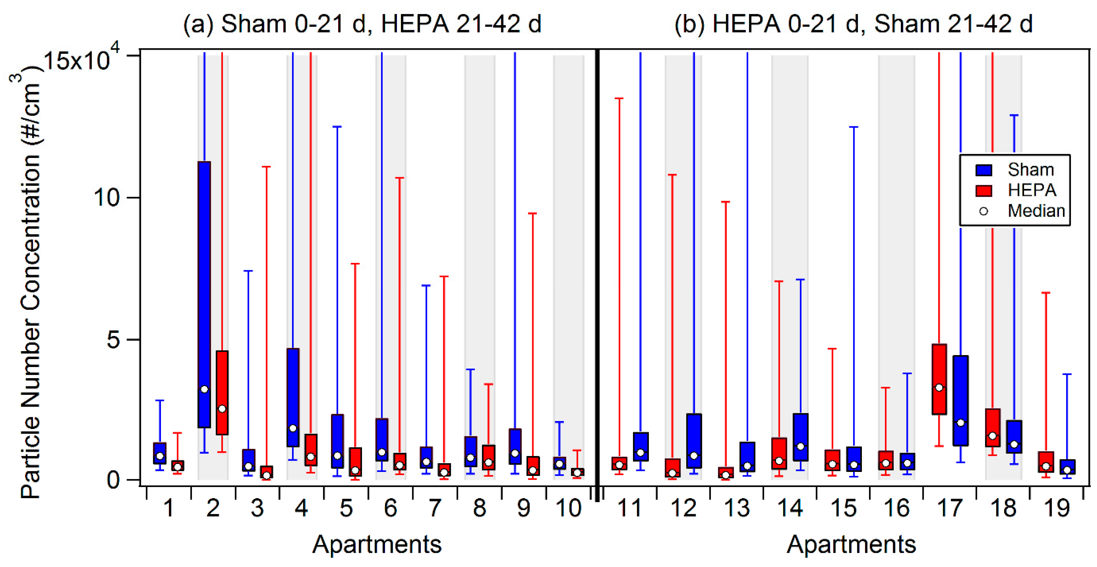 Box plots of all PNC measurements from each participant’s apartment stratified by filter order: (a) sham for first 21 days followed by HEPA for last 21 days; (b) HEPA for first 21 days followed by sham for last 21 days. The whiskers represent the 5th and 95th percentiles; open circles represent the median PNC values. Note that the apartments are not numbered in chronological order (see Table 2).
