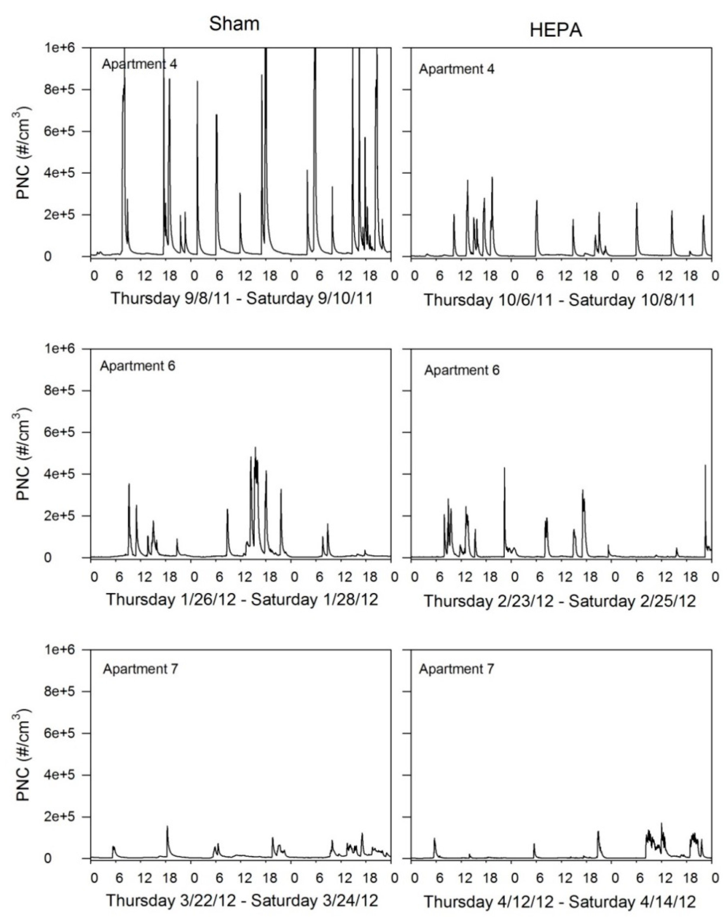 Time-series plots of 1-minute-averaged PNC for three apartments shows the impact of spikes presumably related to indoor activities such as cooking, cleaning, and candle and incense burning.