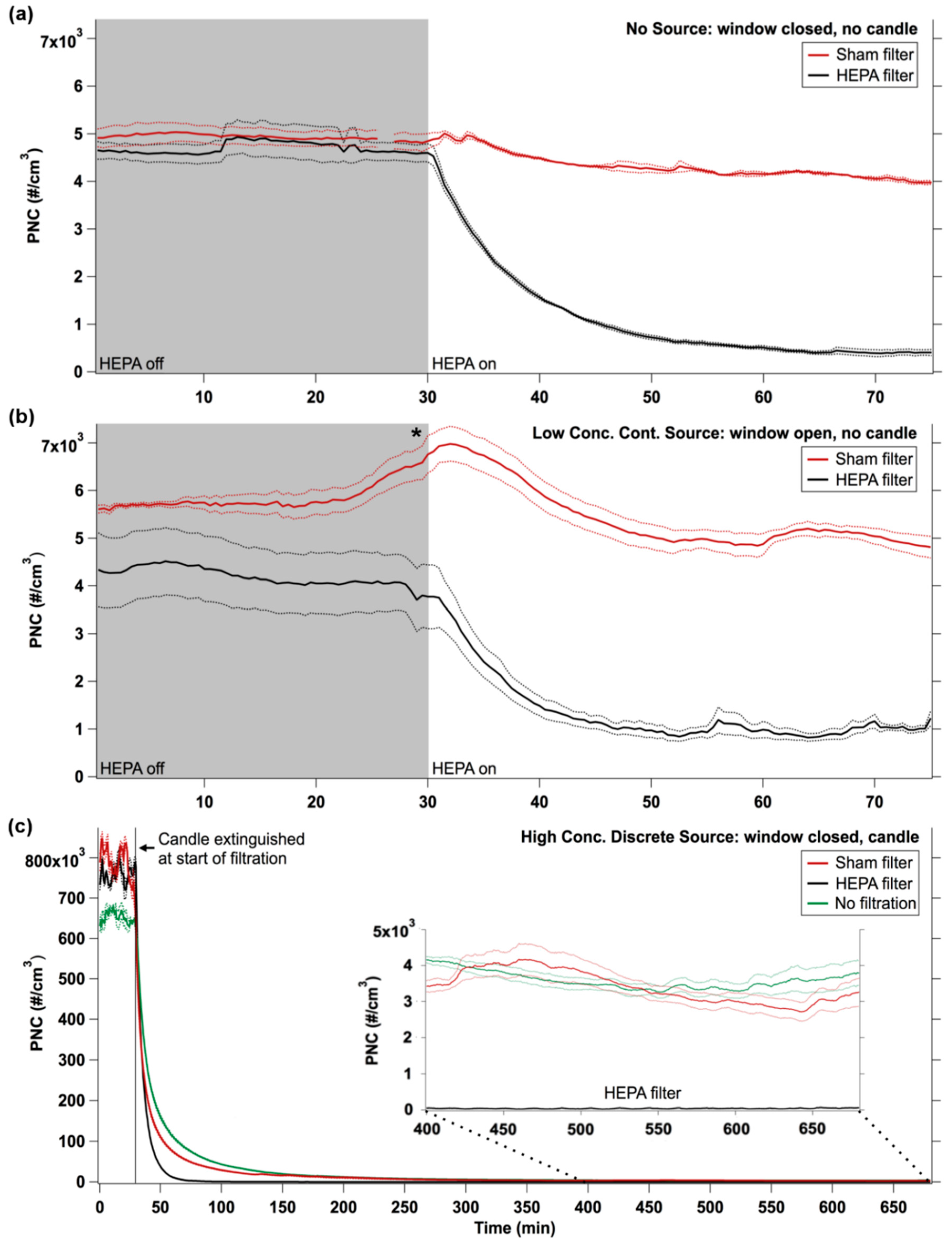 Results of HEPA and sham filtration experiments in an unoccupied bedroom for three PNC-source conditions: (a) no source, (b) low concentration, continuous source (ambient air through an open window), and (c) high concentration, discrete source (a lit candle that was extinguished at t = 30 min (note that HEPA was on at t = 0 min)). Solid lines represent the mean of three replicate experiments; dashed lines represent the standard error (SE). * The increase in PNC was due to an outdoor source that coincided with one of the three repetitions of the experiment.