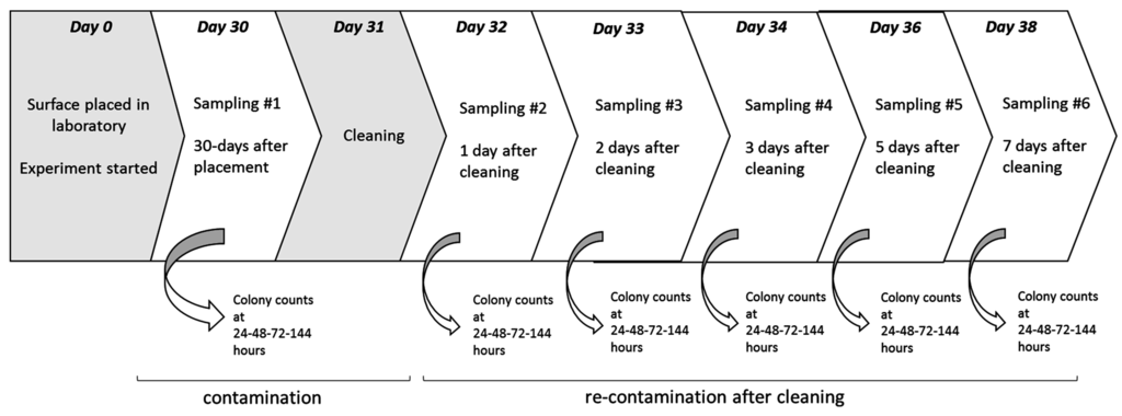 Surfaces were cleaned with a natural-based detergent (BluEsprit®, Eco12, Italy) using a paper towel, as is usually done in laboratories. The detergent is completely biodegradable, according to the OECD guidelines [22]. Samples were collected from surfaces every 24 h for six days. All plates were incubated for 144 h, and colony counts were registered at 24, 48, and 72 h. The surfaces were divided into 18 subareas such that 3 portions of the surface (separate from each other) were sampled per day. We assumed that contamination was equal across the entire surface.