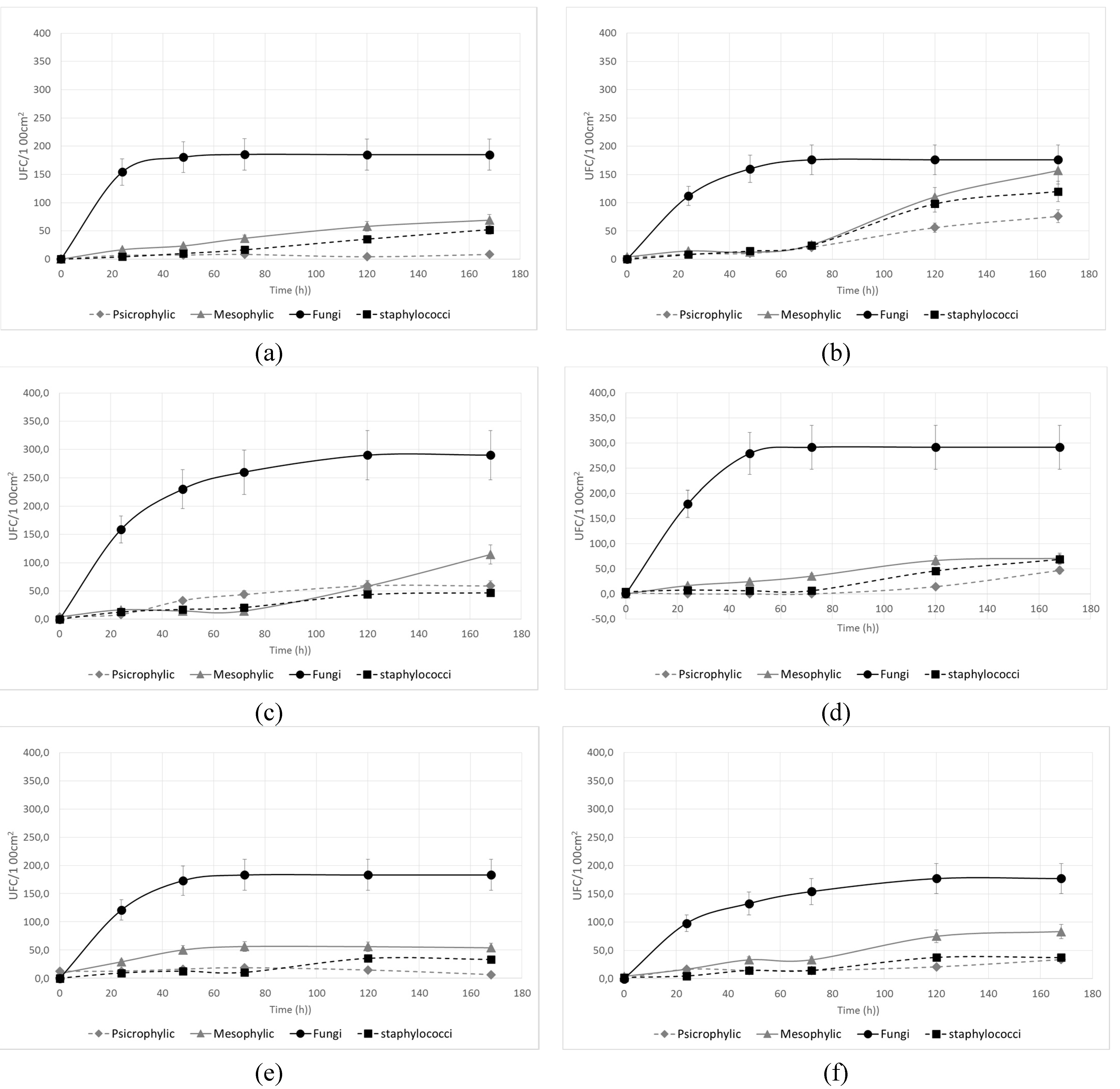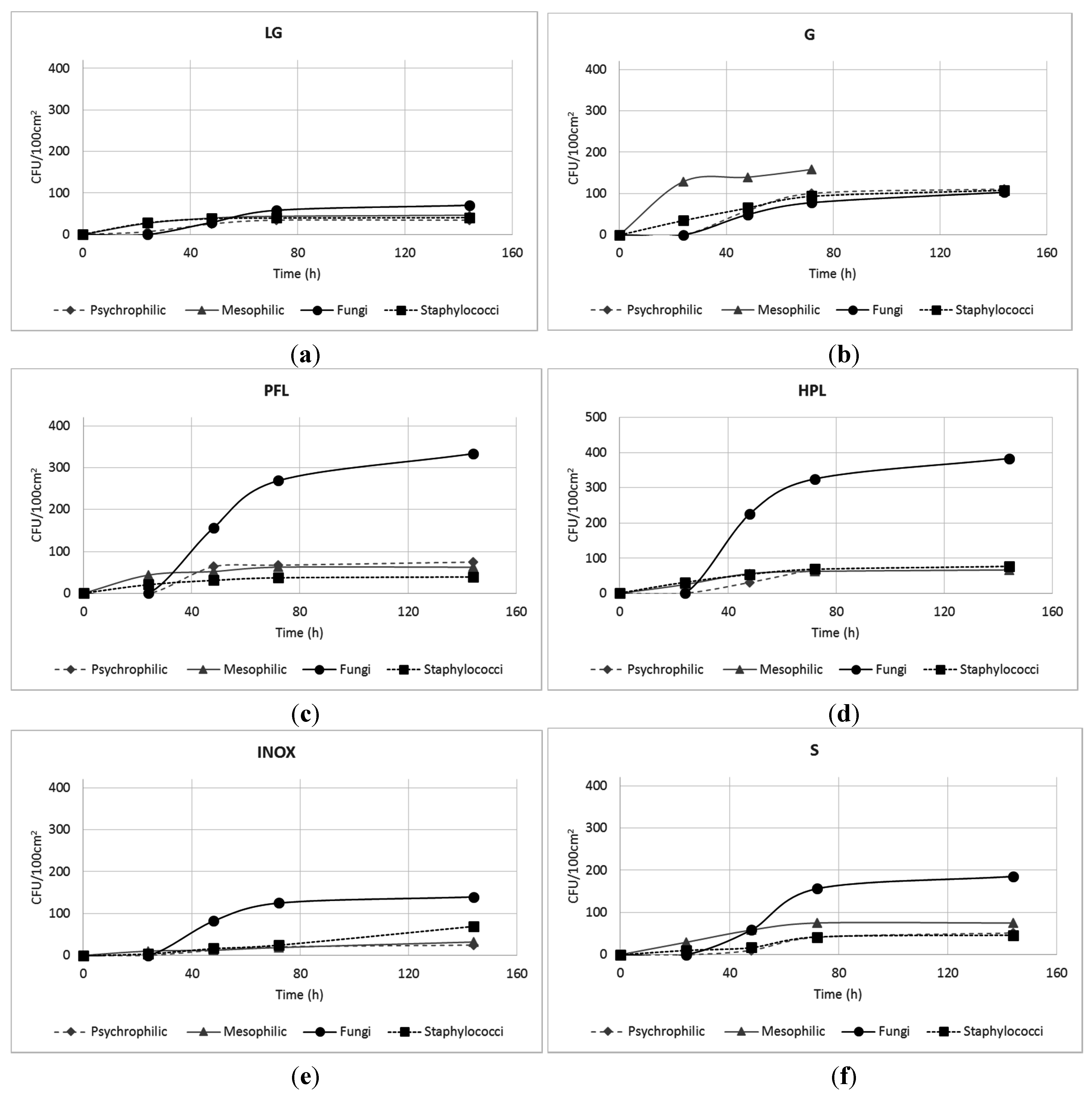Figure 4. Microbial kinetics of re-contamination after the cleaning treatment for (a) fine porcelain stoneware (LG); (b) glass (G); (c) post-forming laminate (PFL); (d) high-performing laminate (HPL); (e) stainless steel (INOX); (f) enamel steel (S).