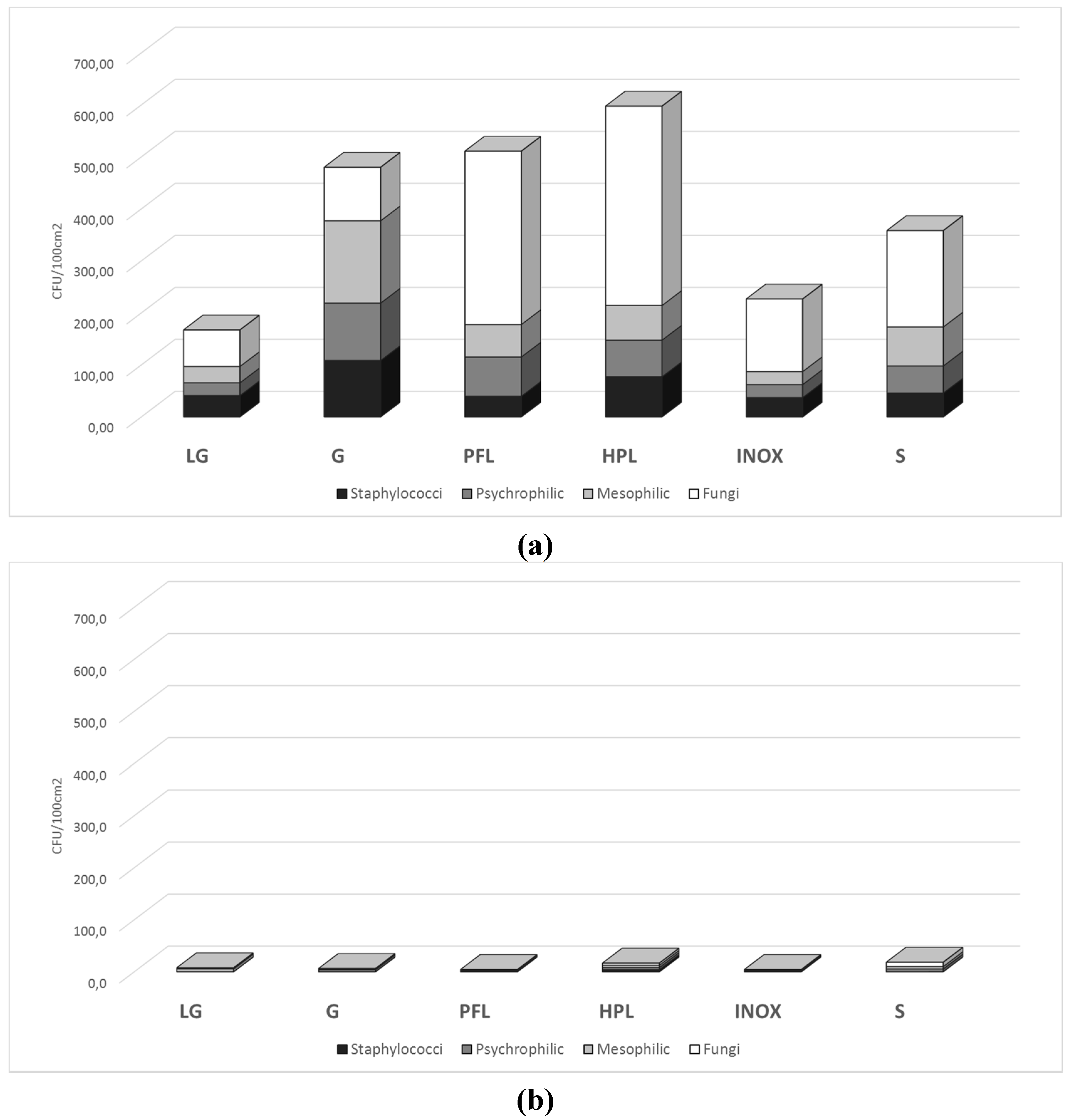 Figure 3. Total microbial counts (a) after 30 days of environmental exposure and (b) after the cleaning treatment.