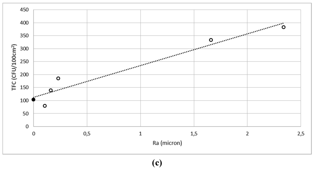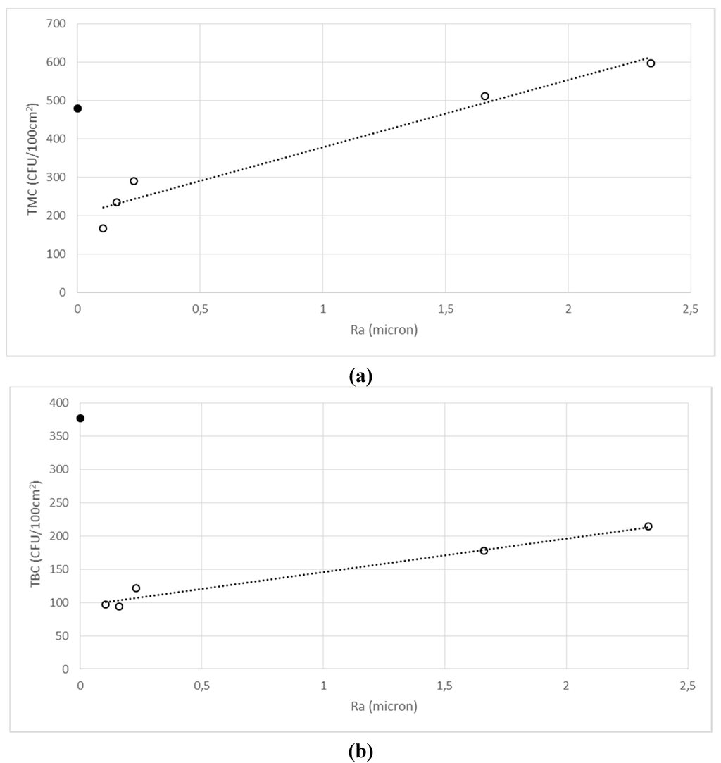 Both Ra and Rt values for the six surfaces are reported in Table 2, together with the total bacterial count (TBC), the total fungal count (TFC) and the total microbial count (TMC) calculated as the sum of TBC and TFC. As expected, positive correlations were found between the Ra and Rt values; therefore, for the sake of simplicity, only the microbial counts versus Ra relationships are reported in Figure 5.