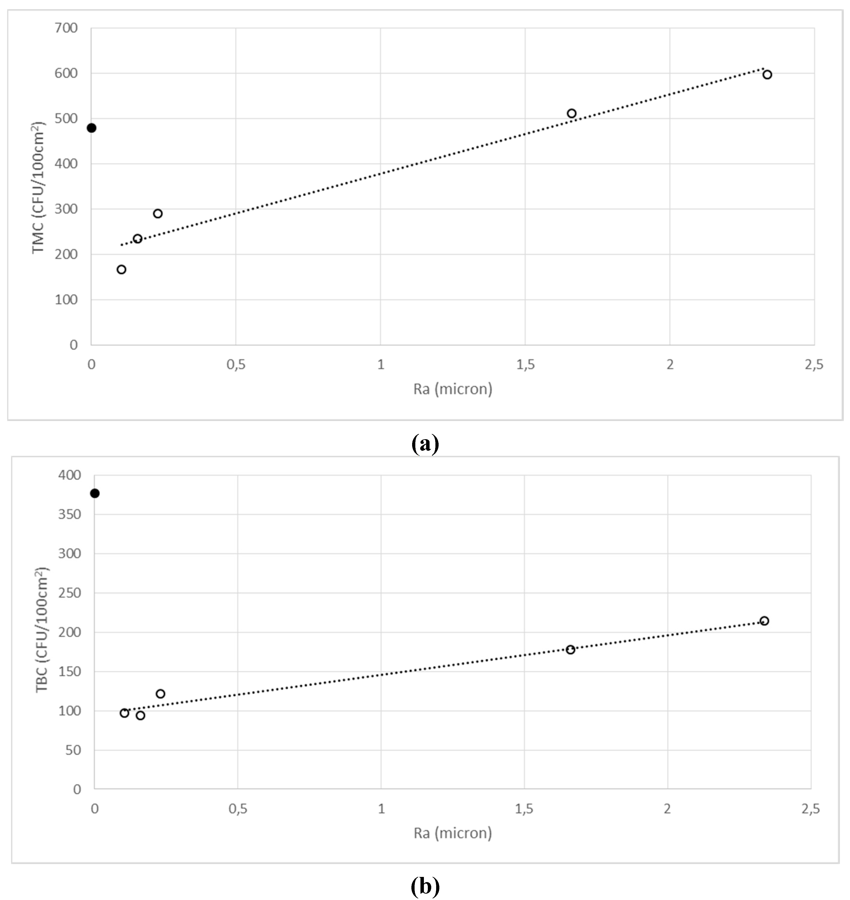 TMC (Figure 5A) and TBC (Figure 5B) were linearly correlated (R2 = 0.9598 and R2 = 0.9661, respectively) with surface roughness for five surfaces (empty circles), but not the outlier glass (full circle), whilst TFC (Figure 5C) was linearly correlated (R2 = 0.9451) with all six samples.