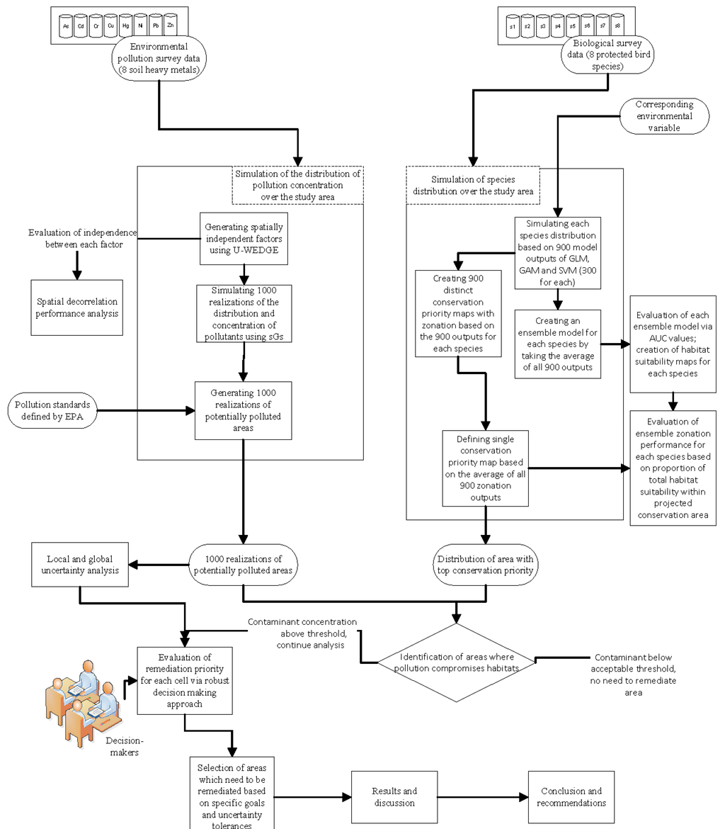The flowchart of the approach used in this study is illustrated in Figure 1. To evaluate the impacts of heavy metal-contaminated soils on focal species within the proposed conservation areas, the concentrations of eight heavy metals were projected across the study area. The analysis of soil contaminants comprised the following steps. First, the U-WEDGE method was used to transform the concentrations of the eight metals into eight spatially uncorrelated factors to perform multivariate simulations without the need to consider the interactions among the eight metals. The normalized uncorrelated factors were then fed into sequential Gaussian simulation (sGs), which generated 1000 realizations of possible soil heavy metal distributions, instead of simply projecting a single estimate. sGs therefore allowed for more realistic uncertainty analysis. The local and spatial (global) uncertainties of areas that require monitoring or remediation were then analyzed. In terms of species distributions, a total of eight bird species, seven with “rare and valuable” protection status [], were considered. The analysis of the distribution of species and the selection of conservation areas involved two ensemble modeling techniques that considered both individual species habitat preferences and the conservation needs of all species of interest. The first integrated 300 outputs of three species distribution models (SDM) into a single ensemble SDM. Zonation was then applied to the 900 outputs of the SDMs to generate 900 conservation priority maps for each species. The average of these conservation priority realizations was used as the ensemble conservation output that took into account the distribution of all eight species. The ensemble zonation output ultimately determined the ecological value, or from the point of view of policy makers the top conservation priority, i.e., ecological value in descending order, of each cell (planning unit). Finally, remediation priorities were obtained from the ecological values of focal bird species, the heavy metal distribution maps, as well as the level of uncertainties in heavy metal pollution projections.
