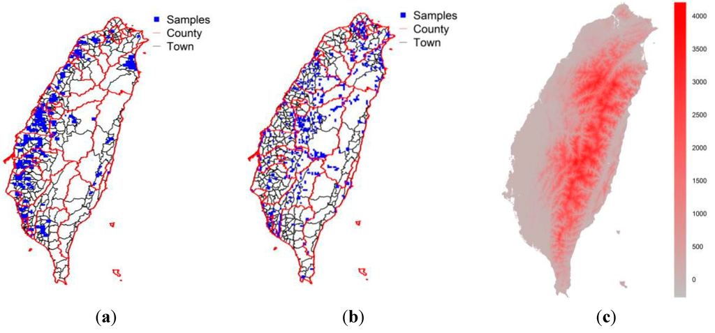 Heavy metal concetrations were obtained from a nationwide survey that was performed by the Environmental Protection Administration (EPA) of Taiwan and involved 2183 soil samples based on a hierarchical sampling structure. In the first step, there were 897 soil samples collected at a resolution of 1600 ha across of Taiwan. Finally, 2183 sites were then sampled across sample units of 100 ha within sites identified as potentially contaminated during the first step. As can be seen, the majority of the sites considered in the second phase of the study were located on the highly industrialized west coast of Taiwan. The soil concentrations of arsenic (As), cadmium (Cd), chromium (Cr), copper (Cu), mercury (Hg), nickel (Ni), lead (Pb), and zinc (Zn) at depths of 0–15 cm were considered. The EPA classifies the concentrations of soil heavy metals into five classes (Table S2, the Supplementary Section 2). Concentrations in the fourth and fifth ranges require intensive monitoring and consideration of remediation. In this study, areas with concentrations within or above that of the fourth range are regarded as polluted.
