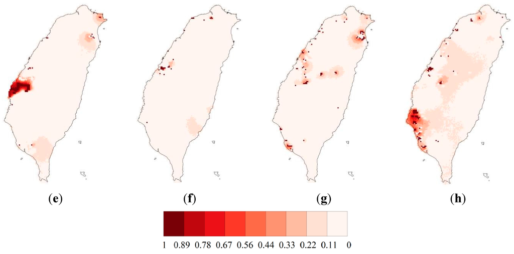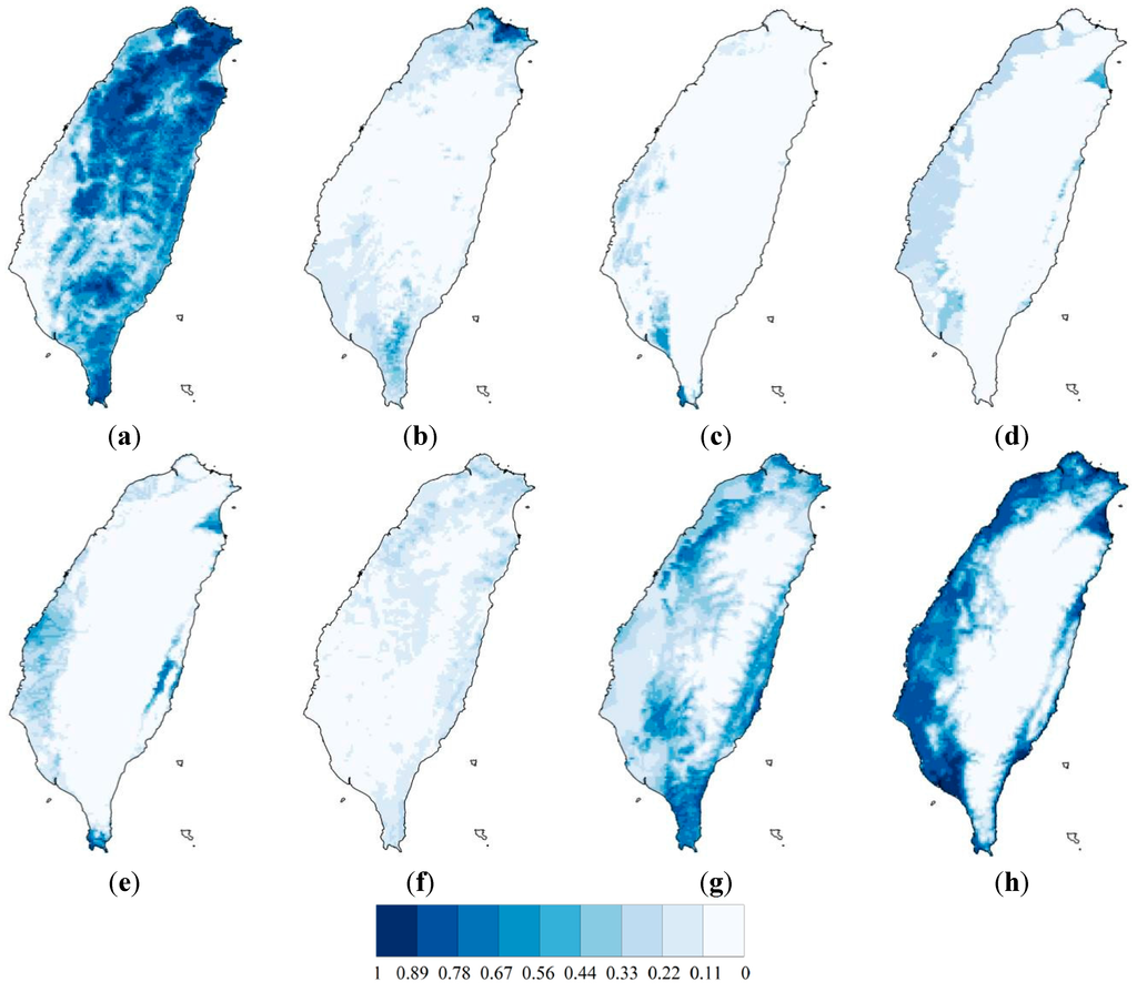 The average habitat suitability index projected by 900 outputs of general linear model, general additive model and supporting vector machine for (a) A. trivirgatus; (b) M. migrans; (c) H. chirurgus; (d) R. benghalensis; (e) G. maldirarus; (f) O. lettia; (g) G. Taewanusand; (h) A. cristatellu.