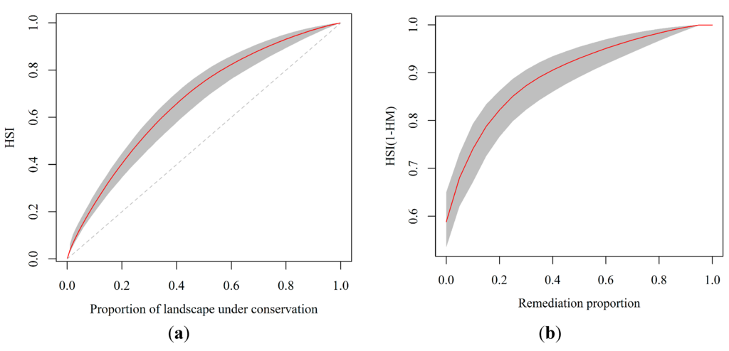 (a) Proportion of species’ habitat under protection as a function of total HSI value and proportion of total landscape under conservation; (b) Proportion of pollution-free habitat HSI(1-HM) on potentially contaminated area (grey color: 95% confidence interval). The HSI is the habitat suitability index from zero to one; HM is the heavy metal contamination: when a site is projected as contaminated and therefore unsuitable for habitation.