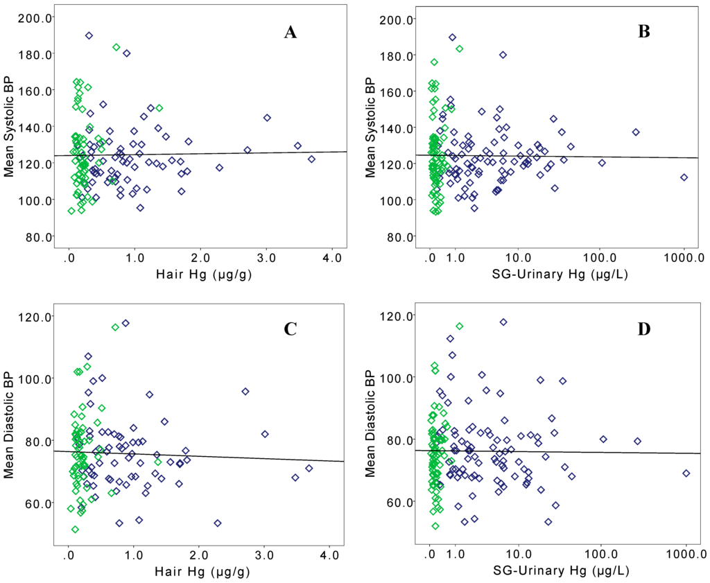 All linear regression models were ran including and excluding outliers with emergency high BP or SG-adjusted urinary Hg > 45 µg/L. Participants excluded for emergency high BP all had SG-adjusted urinary Hg concentrations below 6.5 µg/L. Three Kejetia participants with very high urinary Hg levels were excluded as outliers (SG-adjusted urinary Hg was 998.0, 268.4, and 106.5 µg/L for outliers). Exclusion of outliers (emergency high BP or SG-adjusted urinary Hg > 45 µg/L) improved the strength of the associations in linear regressions and are presented here.