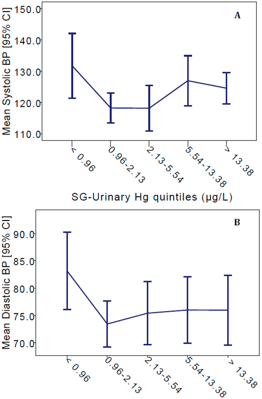 Mean systolic (A) and diastolic BP (B) by quintiles of SG-adjusted urinary Hg concentrations in Kejetia. Error bars represent 95% confidence intervals.