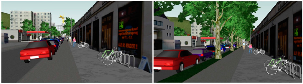 Both videos showed a stroll through a living environment in a typical German city. Depending on their randomized assignment, each subject saw either Version A or B of the video. Both show the same walking route, but Version A depicts a typical city and living environment in which (some) cars are parked such that they partially cover the sidewalk, whereas version B depicts a living environment in which cars are parked in parking spaces adjacent to the sidewalk and a grass verge with trees is between the sidewalk and the parking spaces (see Figure 1). No other features differentiate the environments shown in the two videos. For instance, the number of cars, sidewalk width and number of fictitious pedestrians are the same.