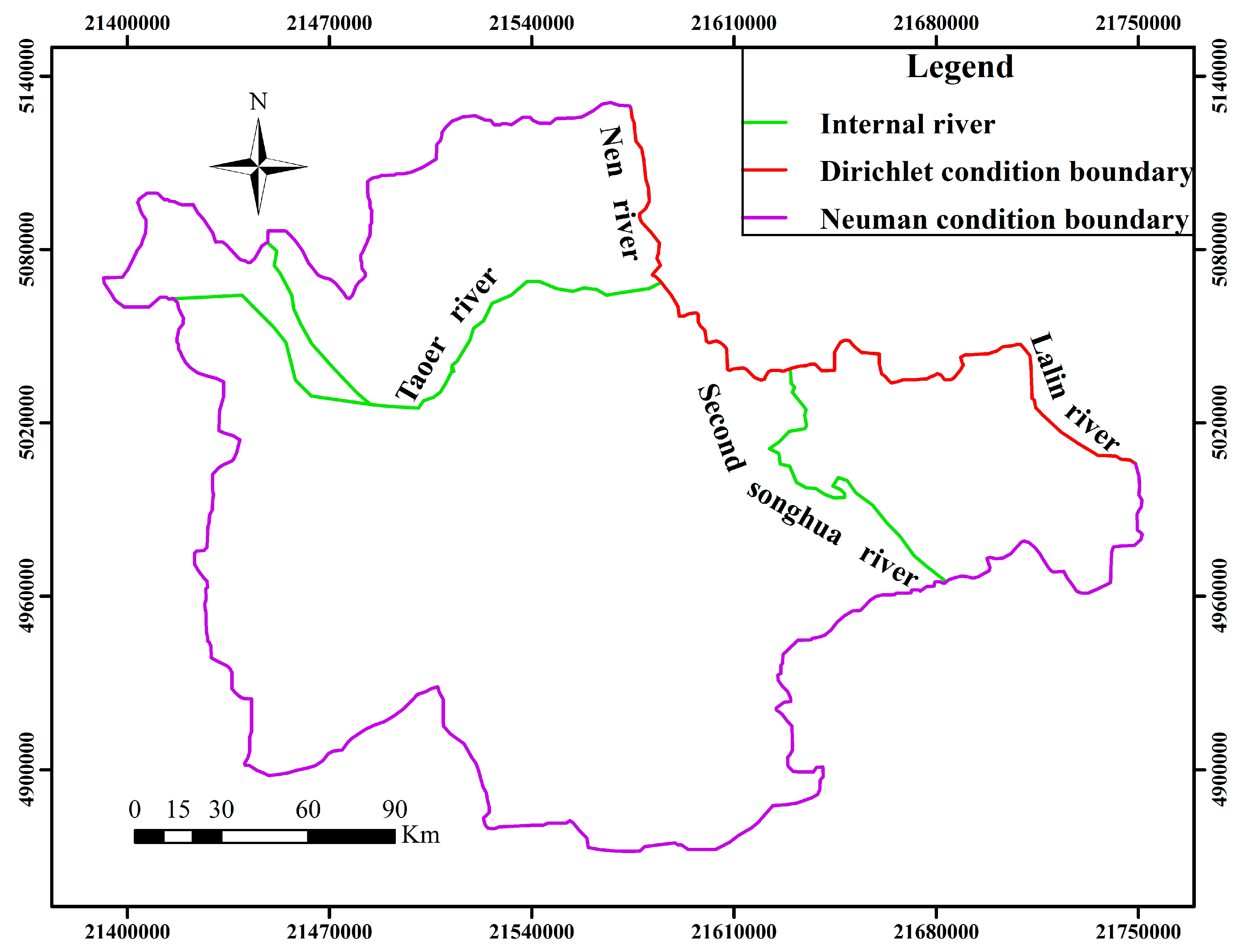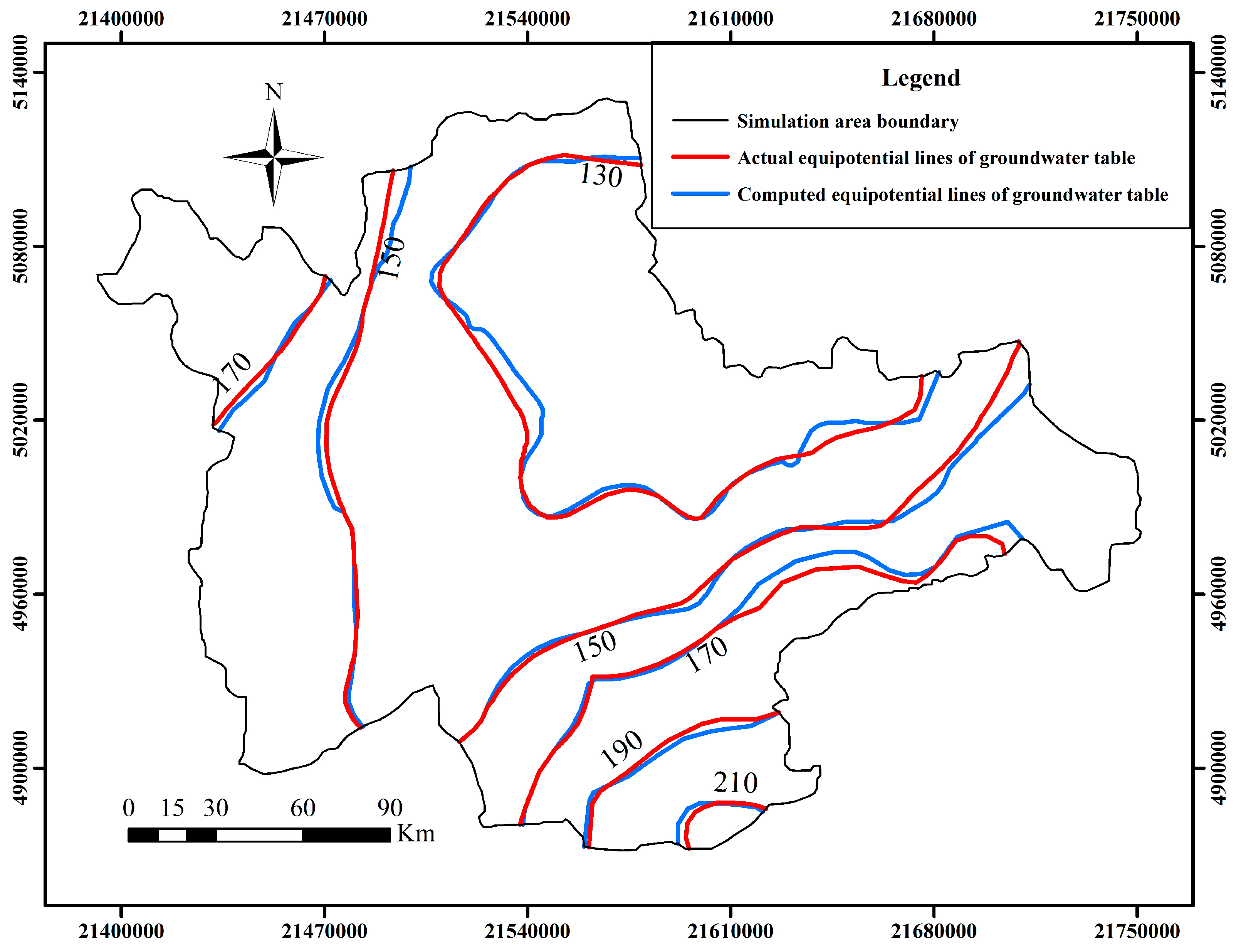 - The groundwater table values calculated by the numerical simulation model of groundwater flow are very close to the actual measured values both at the stage of model calibration and model verification, which demonstrates that the selected hydrogeological conceptual model generalization, partial differential equations and algorithm are reasonable and feasible in the study area, and the established numerical simulation model of groundwater flow can objectively and accurately describe the groundwater flow characteristics of the study area. These research results can provide a good foundation for establishing a surrogate model.