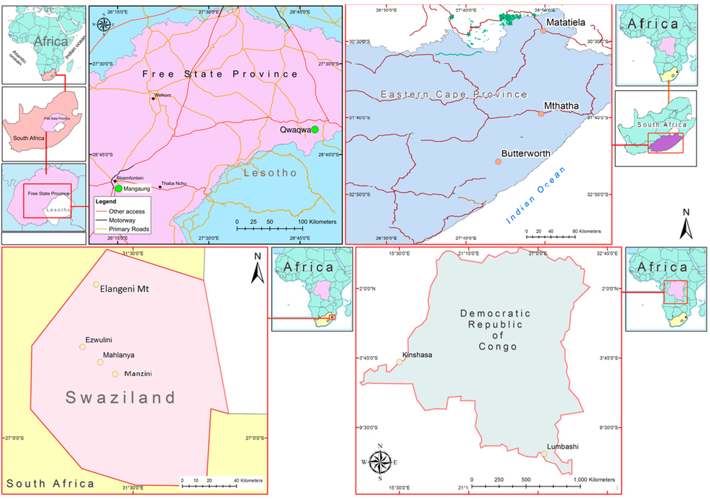 Soils ingested in Swaziland were collected from Ezulwini, Mahlanya, Mphembekati and Mbekelweni (Manzini neighborhood), Elangeni Mountain, and Nsingweni (Figure 1). Swaziland soils are highly weathered ferralitic soils having a low cation exchange capacity (CEC) in the high veld region whereas those from the low veld region (Manzini, Mahlanya and Ezulwini) are moderately weathered with a higher clay content and CEC []. The soil samples from Democratic Republic of Congo were collected from Lubumbashi and Kinshasa. Though arenosols derived from the Kalahari sands dominate the soil cover of Kinshasa, strongly weathered ferralsols make up a greater part of the soil of DRC []. These soils are characterised by a sandy texture, low clay content and low CEC. Samples of geophagic soils ingested in South Africa came from Bloemfontein and the Eastern Cape. Sandy to clayey and shallow soils are found in the Bloemfontein region whereas soils from the Eastern Cape generally contain less than 15% clay and are mainly derived from the weathering of basalt and dolerite origin. Quartz, mica, and/or kaolinite dominate the mineral composition of these soils [].