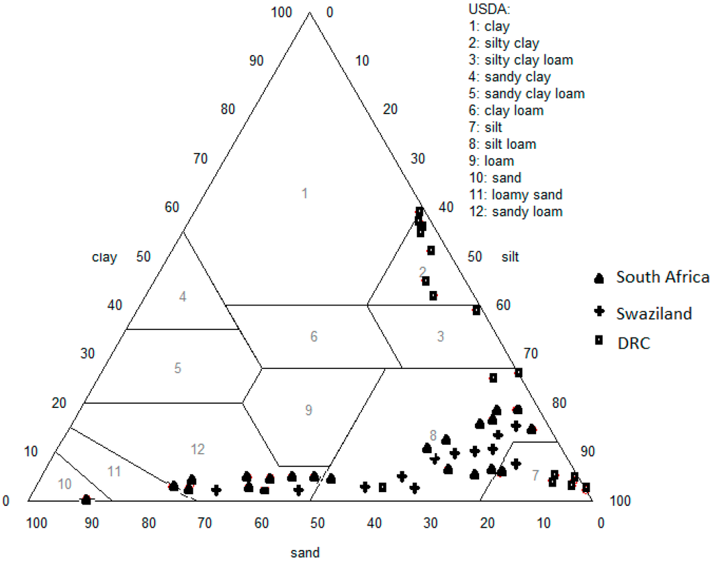 The textural classification of the soil samples places most of the samples from South Africa and Swaziland within the sandy loam and silty loam textural groups whereas the soils from DRC were mostly classified as silt or silty clay (Figure 3). This textural classification of the soils contradicts the belief that soils that are deliberately ingested are clayey in texture. The current processing methods of heating and addition of salts employed by vendors of these geophagic soils would have no influence on the granulometric properties which are determined by the soil particle size distribution. Heating may however decrease the parasite and pathogen load of the samples reducing the potential negative effects of geophagia.
