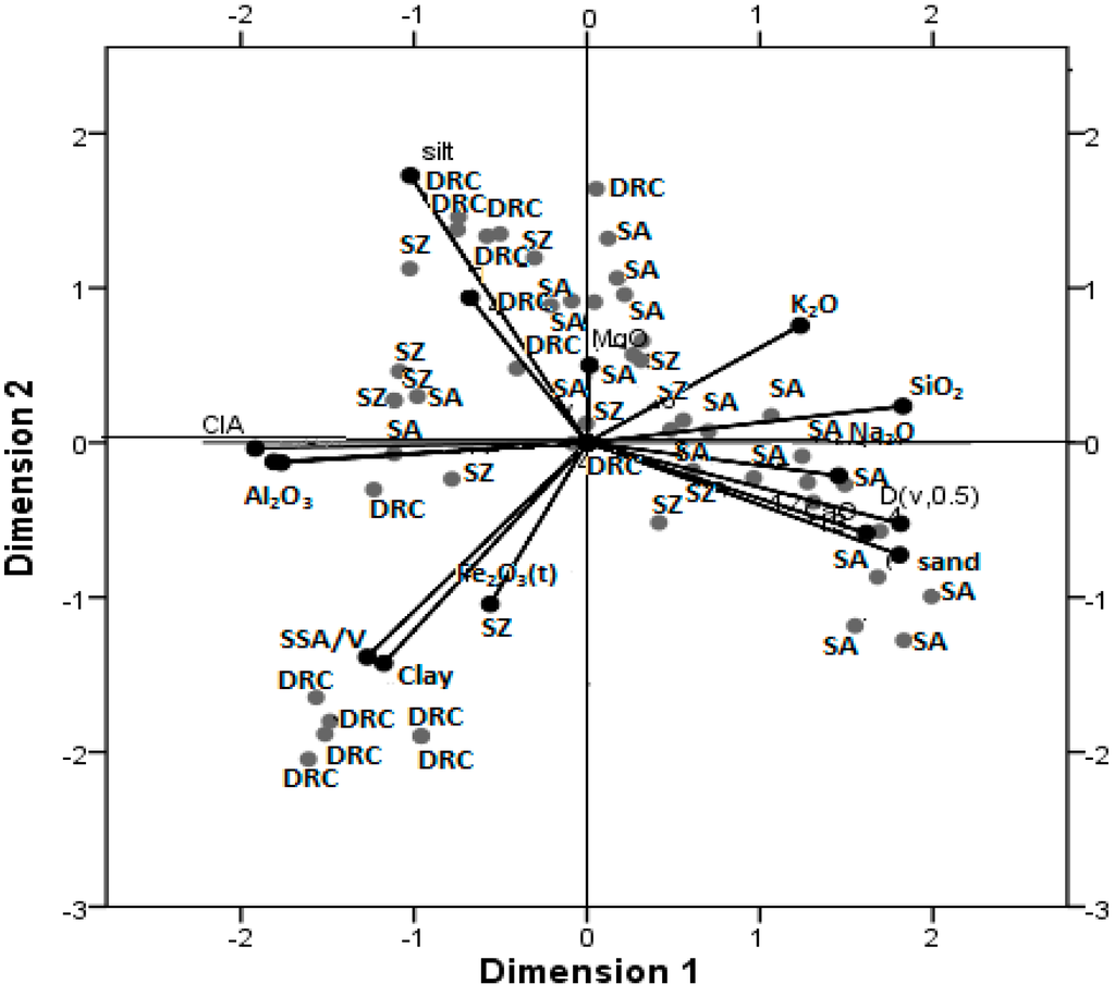 The properties of soils that have not been influenced by anthropogenic activities show specific relationship with each other. Multivariate analyses of soil properties are sometimes used to understand associations of soil properties to understand any anomalies. Biplots from principal component analyses indicate two main factors contributing 50% of the variance observed in the properties of the soils. A greater percentage of samples from South Africa were associated together with SiO2, sand, K2O, CaO, MgO positively on the first component whereas samples from DRC associated with silt, clay, Al2O3, and CIA negatively on the same component. Samples from Swaziland were mainly associating with silt, Na2O and MgO positively on the second component (Figure 5).