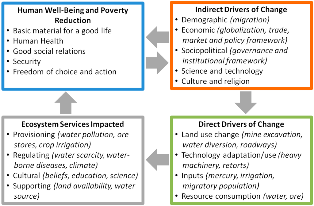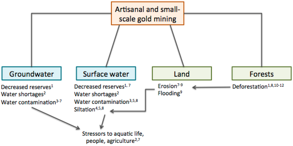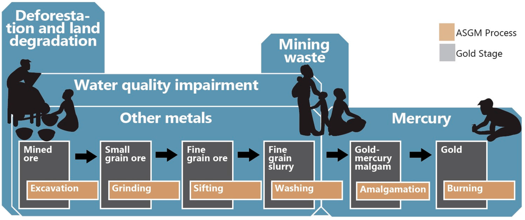 Artisanal and small-scale gold mining, like other extractive activities, raises numerous environmental concerns. Emissions of mercury (Hg) into the atmosphere as well as direct releases of mercury to soil and water are of primary concern because of the extensive use of mercury to amalgamate gold by artisanal miners. Recent estimates suggest that the ASGM sector is the primary source of mercury into the global atmosphere, accounting for approximately 37% (727 tonnes) of all global emissions [6]. While mercury has gained most attention, there exist many other direct and indirect factors that contribute to poor ecological conditions in ASGM communities (Figure 1). This necessitates that impacts on the natural system, as well as planning for interventions be viewed under a broad ecosystem lens.